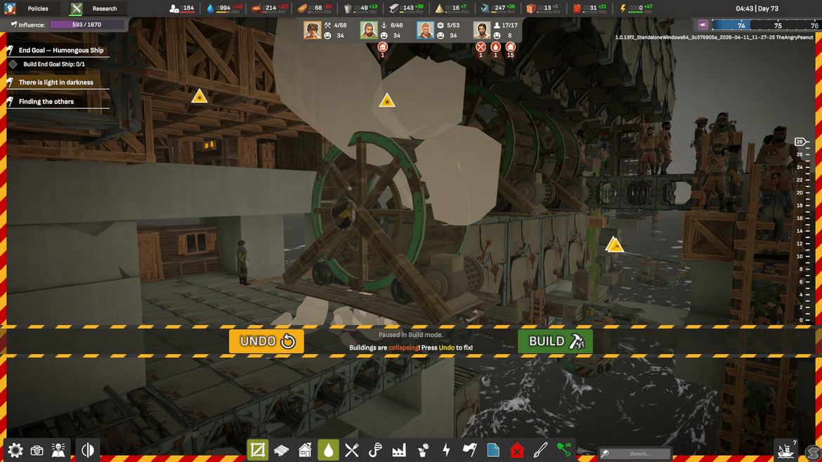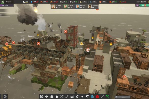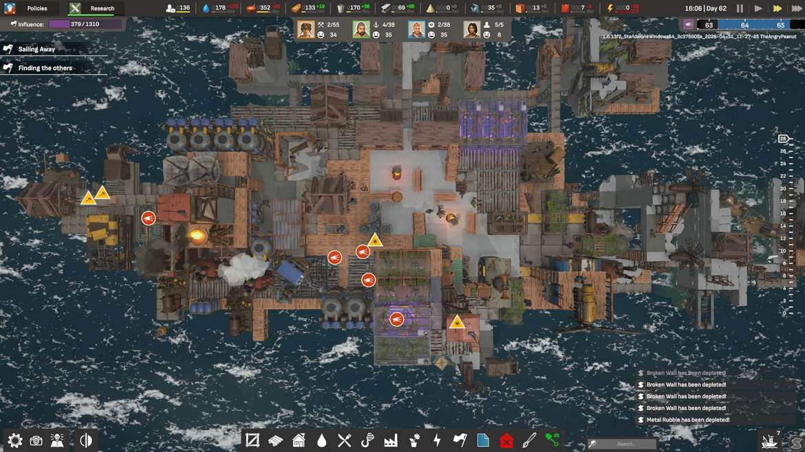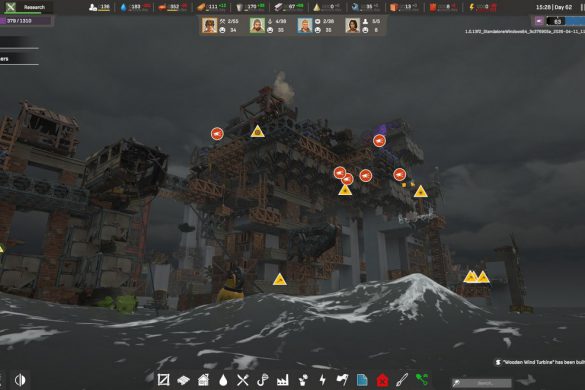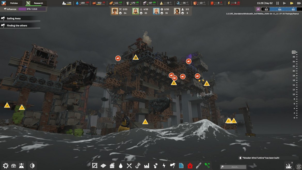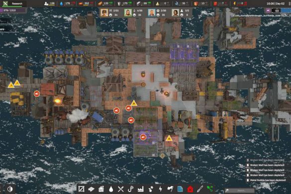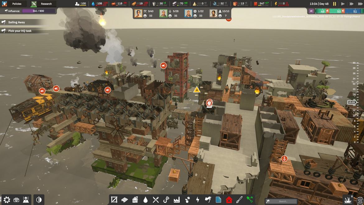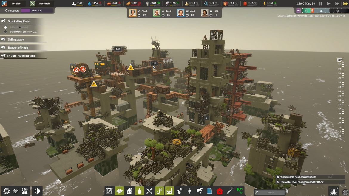 Vi börjar med att vi finna oss strandsatta längst upp på en gammal skyskrapa med dryga åtta bybor som vi snabbt sätter i arbete. Fokuset just nu ligger i att gå och samla virke, skräp och mat, sedan börjar vi så smått bygga de första bostäderna och arbetshusen. Allpartsconnected erbjuder oss gott om information i starten för att få bollen att börja rulla och nöjet av att få saker på plats kommer snabbt, men informationsförmedlingen blir tyvärr sämre längre fram. Tur nog är spelets upplägg såpass intuitivt att du kan lista ut många av reglerna, men tydligare info under rätt tillfällen hade inte skadat.