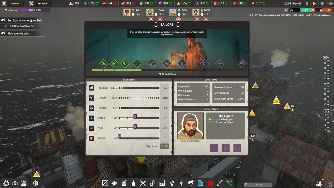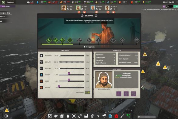 Gällande detta har vi också tre olika medborgarklasser – Arbetare (Workers), Ingenjörer (Engineers) och Sjömän (Sailors). Lite senare i spelet får vi även utanförstående (outsiders) som vi kan träna i det yrke vi vill ha dem. Alla har sina behov och viljor, fast ändå inte; de har dessa men klasserna känns aldrig distinkta eller skiljbara utöver att de kan göra vissa unika arbeten. Att särskilja mellan dessa känns därför ifrågasättbart i stället för att ha en sammansatt arbetsklass. Det känns som att det är en halvhjärtad mekanik i stället för faktiskt fokus, sidouppdrag och eventen känns mer som en distraktion istället för någonting världsbyggande och karaktärsskapande. Alla klasser har också olika glädjemätare som ger olika förmåner om de blir uppfyllda, vilket jag finner mer vara en distraktion från det roliga byggandet. Det känns ungefär som att Allpartsconnected hade en tanke att göra dessa mekaniker djupare, men fokuserade majoriteten av utvecklingstiden på byggmekanikerna.