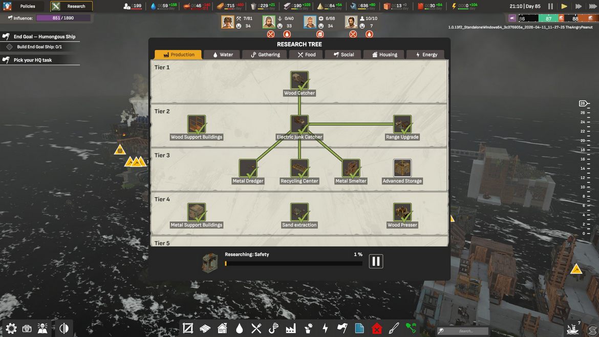 Någonting som sätter ett stort plåster på detta problem är hur teknologiträden utvecklas och vad det innebär för de olika stadie vi går igenom med vårt samhälle. Metall är mycket stabilare än trä och kan därför användas för att bygga större plattformar, cement gör detta ännu bättre. Nu när jag nått slutet på teknologiträden så öppnas nya möjligheter upp som jag endast längtat efter – stora, separata ytor för industrier som ger snabbare åtkomst till resurser för mina invånare – nya lägenhetskomplex som kan börja bygga uppåt mer än i sidled. Om du lyckas bita i och hålla dina invånare vid liv till de sista uppgraderingarna är det inte bara detta en belöning i sig, det öppnar också upp nya möjligheter att forma om ditt samhälle och utökar därför spelets fortsatta spelglädje!