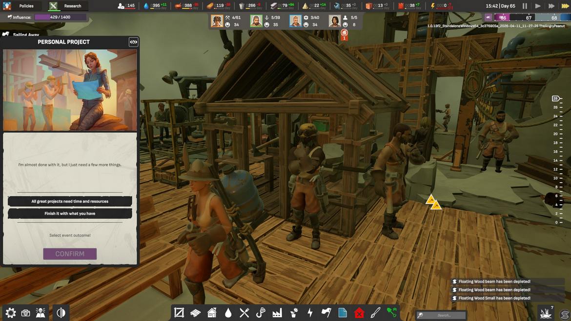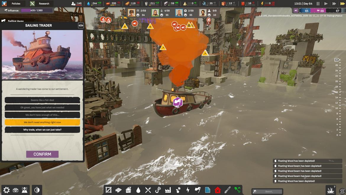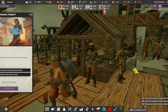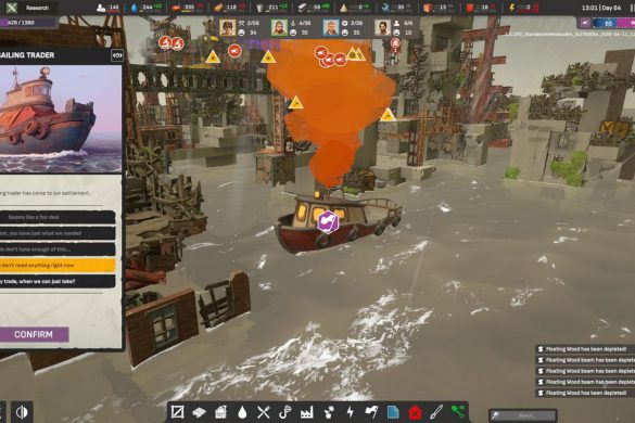När vi är i stadiet där småindustrier, vattenverk och småhamnar med båtar börjar dyka upp så blir även event en del av spelet. Vi är samhällets kapten och måste därför ta ställning i vissa frågor, framförallt inom sådant vi kan och inte kan göra. Dessa är tidsbetingade och kräver vissa resurser för att lyckas med vissa ändamål, som att ha tillräckligt med trä för att vässa spjut mot en fiskmåsattack! Ibland kan kompetens vara en resurs vi saknar för att få ett bättre resultat. Detta kanske låter underligt i åtanke på ALL WILL FALL:s grafiska stilval, men jag gör ständiga och undermedvetna paralleller till Frostpunk och dess uppföljare Frostpunk 2. Båda dessa är katastrofsimulatorer där våra överlevare i slutändan ska frodas, men i frågan om event och sidouppdrag så tappar ALL WILL FALL i denna aspekt.