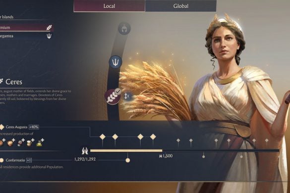 Ser vi till religion, är det en av de kanske mest spännande nya mekanikerna. Varje ö (provins) kan ha sin egen gud, som du väljer från ett pantheon – du kan till exempel välja Mars för militära bonusar, Ceres för jordbruksproduktion eller Neptunus för handel och sjöfart. Genom att generera “belief” via tempel och religiösa byggnader bygger du “devotion”, och när du når vissa nivåer får du konkreta fördelar. Det är inte bara fluff – gudarna påverkar hur din provins utvecklas och hur effektivt vissa produktionskedjor blir. Dessutom kan du byta gud, men det innebär en nollställning av ”devotion” och vissa bonusar, vilket gör valet strategiskt.