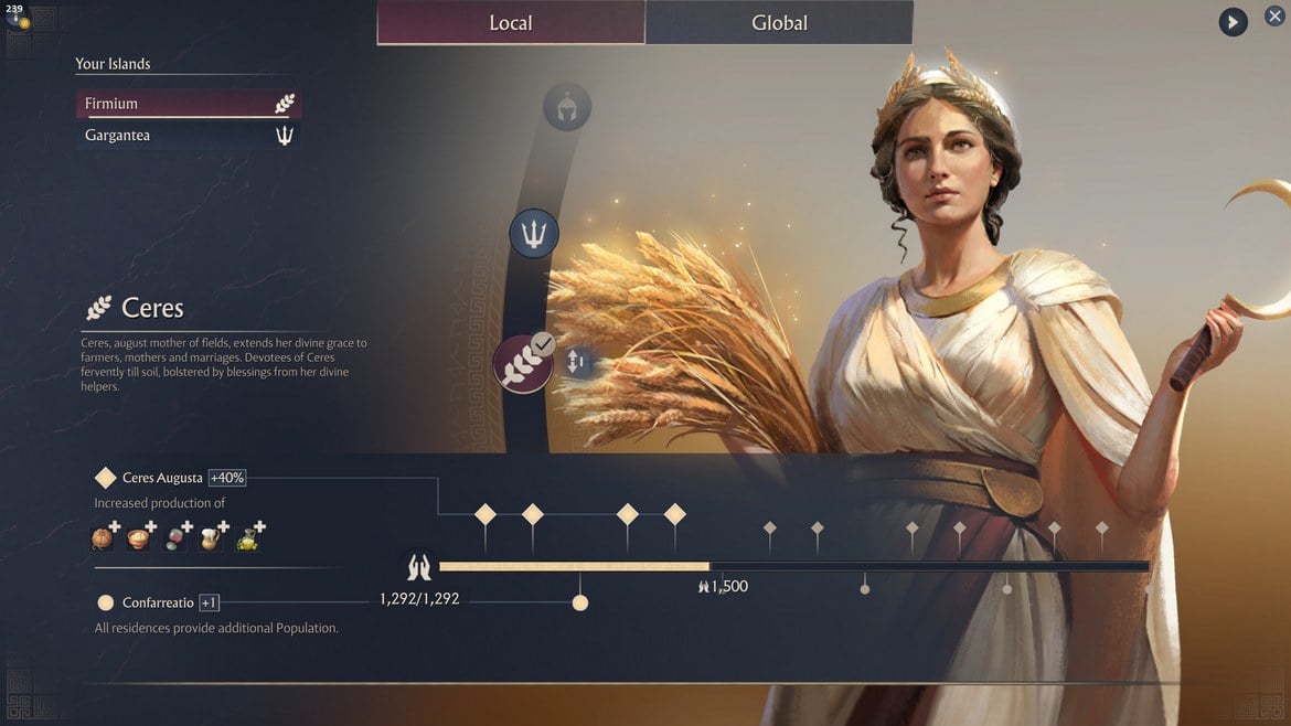 Ser vi till religion, är det en av de kanske mest spännande nya mekanikerna. Varje ö (provins) kan ha sin egen gud, som du väljer från ett pantheon – du kan till exempel välja Mars för militära bonusar, Ceres för jordbruksproduktion eller Neptunus för handel och sjöfart. Genom att generera “belief” via tempel och religiösa byggnader bygger du “devotion”, och när du når vissa nivåer får du konkreta fördelar. Det är inte bara fluff – gudarna påverkar hur din provins utvecklas och hur effektivt vissa produktionskedjor blir. Dessutom kan du byta gud, men det innebär en nollställning av ”devotion” och vissa bonusar, vilket gör valet strategiskt.