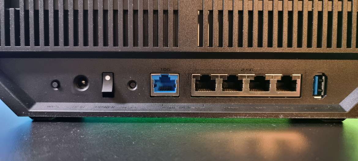Under skalet hittar vi en fyrkärnig 2,0 GHz-processor, 1 GB RAM och 256 MB flashlagring – tillräckligt för att driva avancerade funktioner utan att tumma på stabiliteten. ASUS har också tänkt på anslutningsmöjligheterna: du får en 10 Gbps-port, fyra 2,5 Gbps-portar, samt en USB 3.2 Gen 1-port för delning av lagring eller skrivare i nätverket.