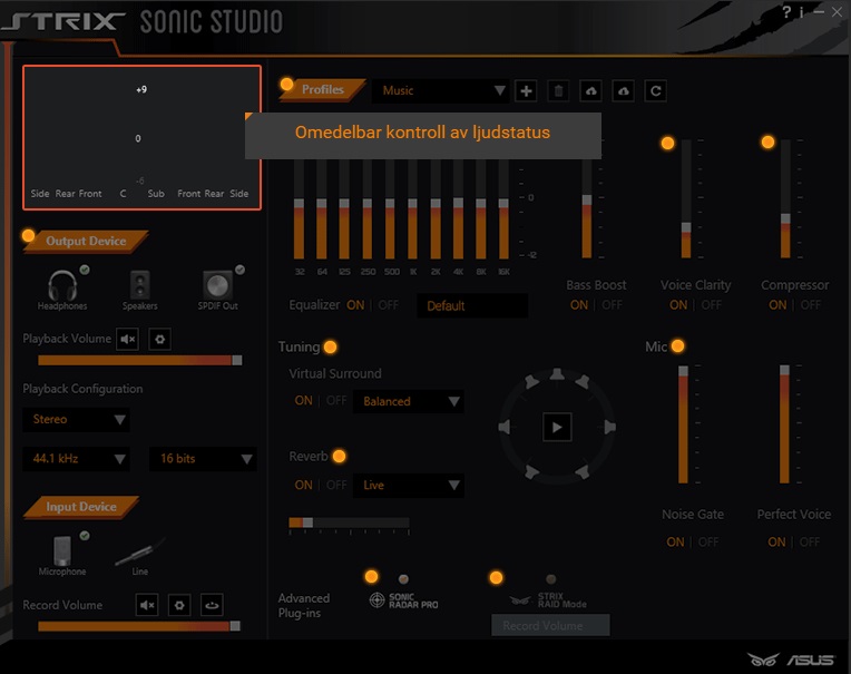 Programvaru mässigt så har man Sonic Studio att hantera hårdvaran med. Däri kan du reglera equalizern efter behag, välja från olika förinstallerade lägen (Musik, film, spel m.m), och även starta virtual surround. Ett surround ljud som är klart och krispigt i spelmiljöer du besöker.