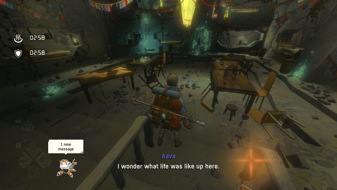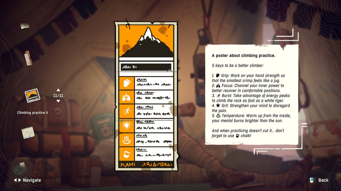 Climbbot är en av de första modellerna av sitt slag, den är inte ett helt ovälkommet sällskap och har lite praktiska användningsområden. Förutom det redan nämnda kan den kompostera skräp som du hittar eller skapar själv –Aava klättrar barfota och hatar nedskräpning. Detta skräp blir talk vilket hjälper dig få grepp även på ställen där det knappt finns något. Aava verkar ha mer varma känslor för sin robot än hon verkar ha för de flesta människor. Vid flera tillfällen fick jag känslan av att hon var bångstyrig och enstörig inte för att hon rakt av ogillar människor, utan snarare att hon inte riktigt vet hur hon ska bete sig. Hon verkar nämligen omtyckt av de människor som skickar meddelanden till henne via roboten – vilka hon aldrig svarar på. Hon kändes märkligt verklig, det finns säkerligen många som skulle kunna känna igen sig i henne.