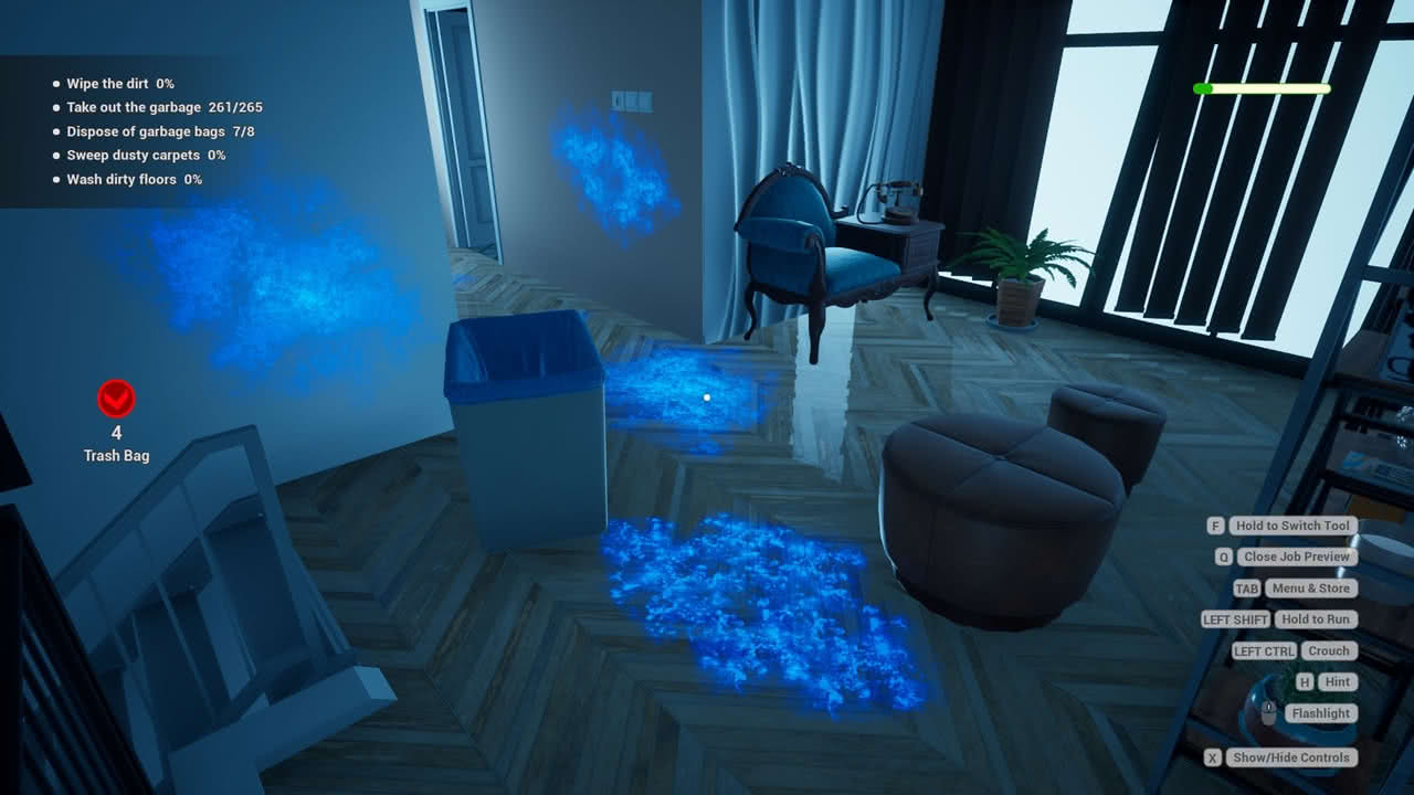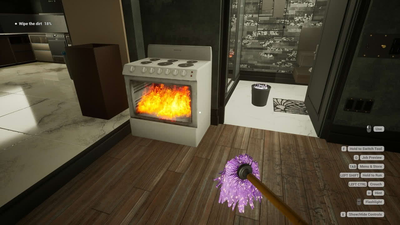 För det mesta fungerar kontrollerna bra, men det är svårt att veta vart jag siktar när jag skrubbar ytor med tvättsvampen. Det har resulterat i att jag inte har städat lika bra som jag trodde och fick spendera extra tid på att leta efter smutsfläckar. Det går att få ledtrådar till vart kvarglömt skräp, smuts eller vad annars jag kan ha missat. Om det skulle vara så att jag ändå inte kan hitta smutsen, även med en ledtråd, kan jag aktivera ”preview mode” som lyser upp smutsen som om jag använde en UV-lampa. Dock vara den effekten bara en kort stund.