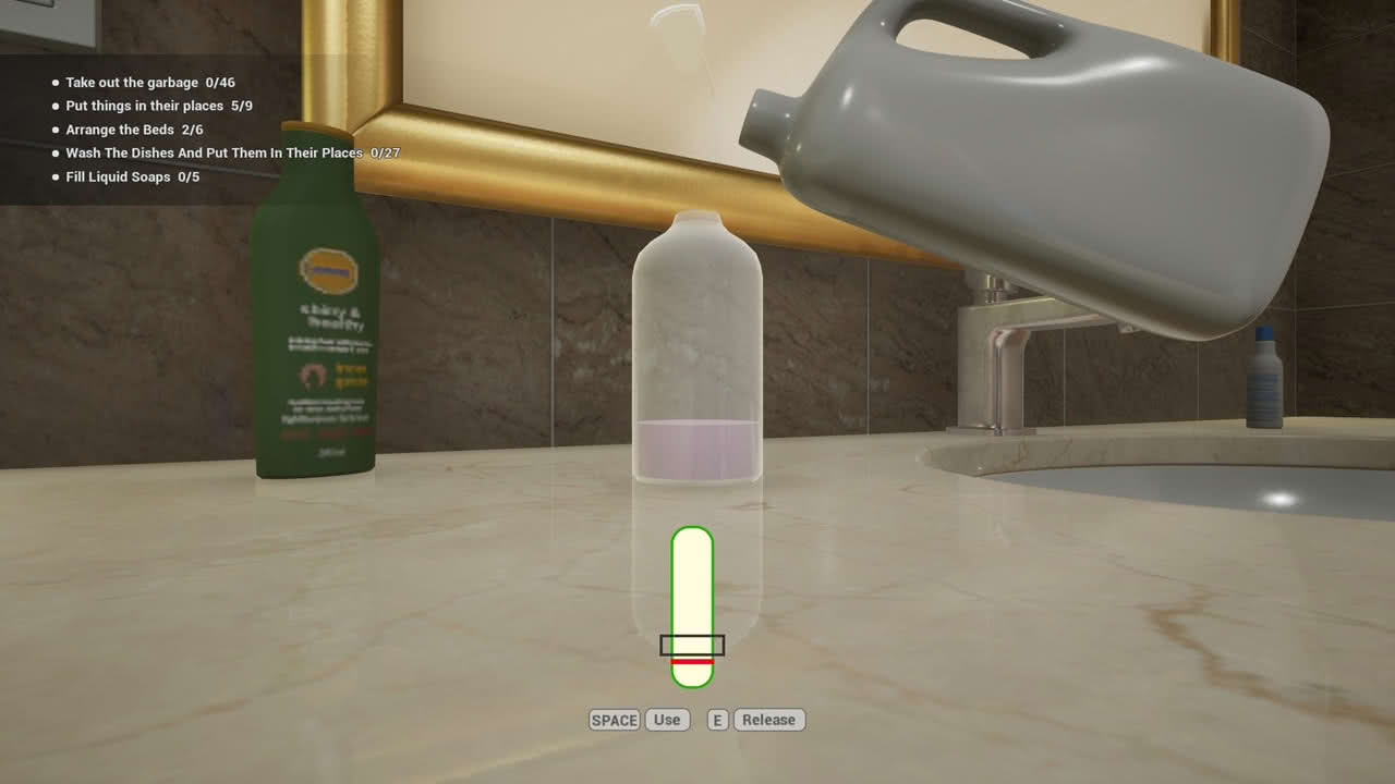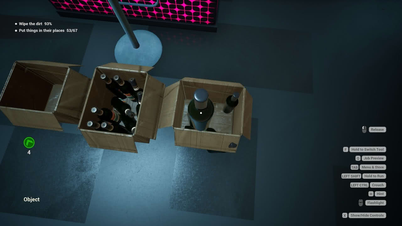Om du vill ha ett varierande spel har du kommit fel, för det här blir snabbt väldigt enformigt. Visserligen är de olika nivåerna varierande med hur de är designade, men själva spelandet blir repetitivt. Jobbsimulatorer har en tendens att bli repetitiva för det finns bara så många sätt att omvandla arbetsuppgifter till spelmekanik. Jag siktar med muspekaren och trycker för att skrubba, plocka skräp eller dammsuga beroende på vilket verktyg det är jag har framme. Ibland ska jag flytta saker till rätt plats, till exempel inne i en bar har jag som uppgift att ställa flaskorna på rätt hyllor. Jag kan dock bara flytta en flaska i taget. En enda. Jag ska ställa upp närmare 70 stycken! Inte för att vara den som är den men nog sjutton kan jag bära mer än en flaska åt gången, eller varför inte låta mig flytta hela lådan närmare?