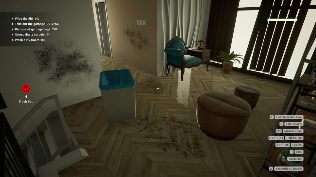 Jag spelade med mus och tangentbord då det kändes mest passande för ett sånt här spel, det går dock att spela med handkontroll. Knapparna ligger väl placerade sett till när jag vill använda de olika funktionerna. Grafiken är inget märkvärdigt, spelet ser ut som andra arbetssimulatorer, med vissa inslag av AI-genererad konst. Det finns musik som spelas när jag spelar en nivå, den är väldigt låg men finns där i bakgrunden. Utöver det har spelet också lite ljud för de olika arbetssysslorna, men det finns ingen större variation utan jag hör samma enstaka splashljud varje gång jag moppar golvet.