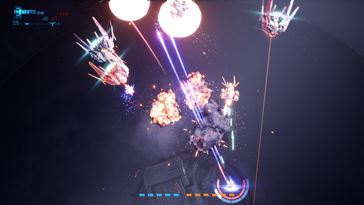 Annat är det däremot med spelets gränssnitt när det kommer till menyer och uppgraderingar, vilket får dess charm att blekna något. De många uppgraderingar som erbjuds ges enbart efter avklarade uppdrag, men som den sanna ’Shmup’ detta är, är det på ’medium’-svårighetsgrad ändå tydligt svårvunnet. Synd att du måste klara nivåerna för att faktiskt erhålla den valuta som krävs för att uppgradera ditt rymdskepp. Nu finns det tack och lov tre svårighetsgrader, där till och med ”easy” kan erbjuda ett underhållande motstånd – men tänk på att hitta och justera svårighetsgraden i det icke-intuitiva menysystemet.