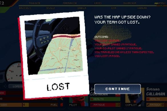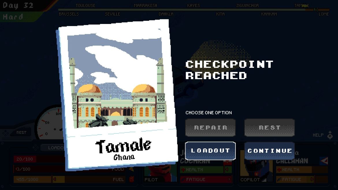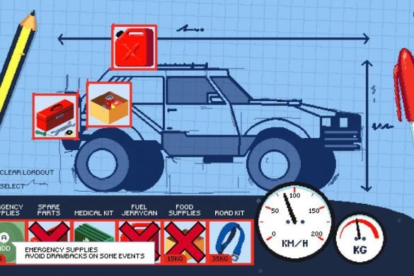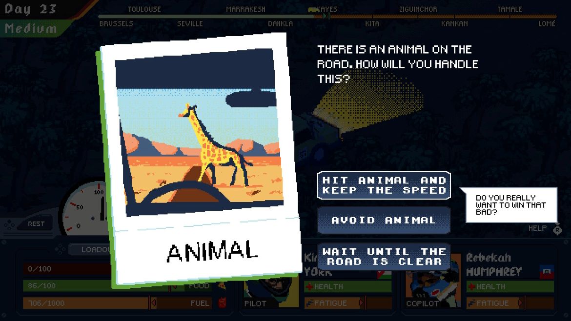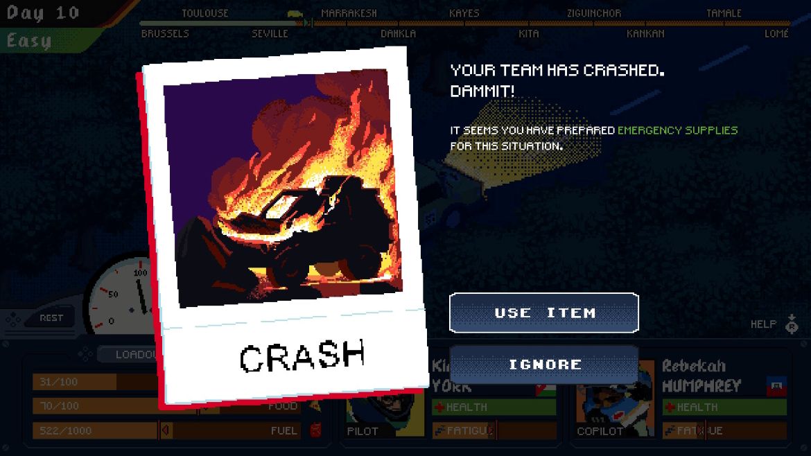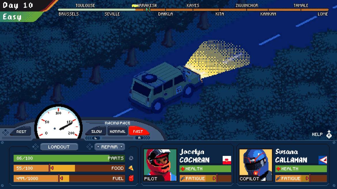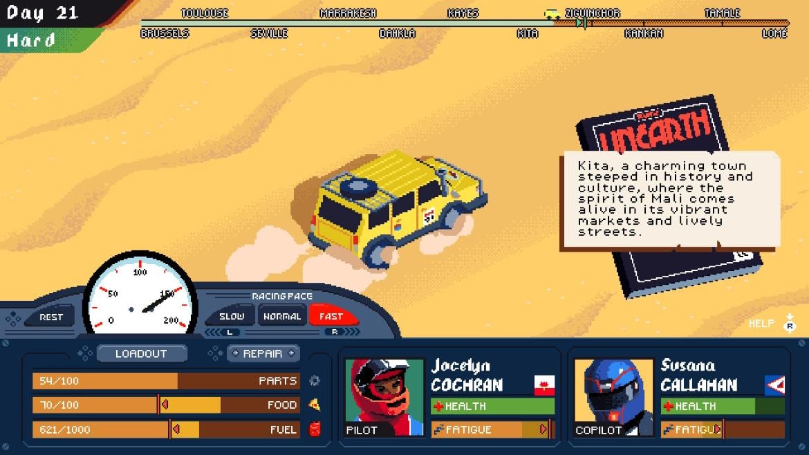 Men vad är detta egentligen för spel, och vad går det ut på? Kort sagt handlar det om ett racingspel där jag inte får styra bilen, ett rougelike som nästan helt saknar variation och ett resurshanteringsspel med fem grundläggande resurser att övervaka. Målet är självklart att ta sig i mål, men också att göra det på så få speldagar som möjligt och med en bil och besättning i så gott skick som möjligt. Detta kräver i sin tur att resurserna hanteras effektivt. Tre av dem rör bilen: drivmedel, reservdelar och mängden packade förnödenheter. De två återstående mätarna handlar om förarens hälsa och ork.