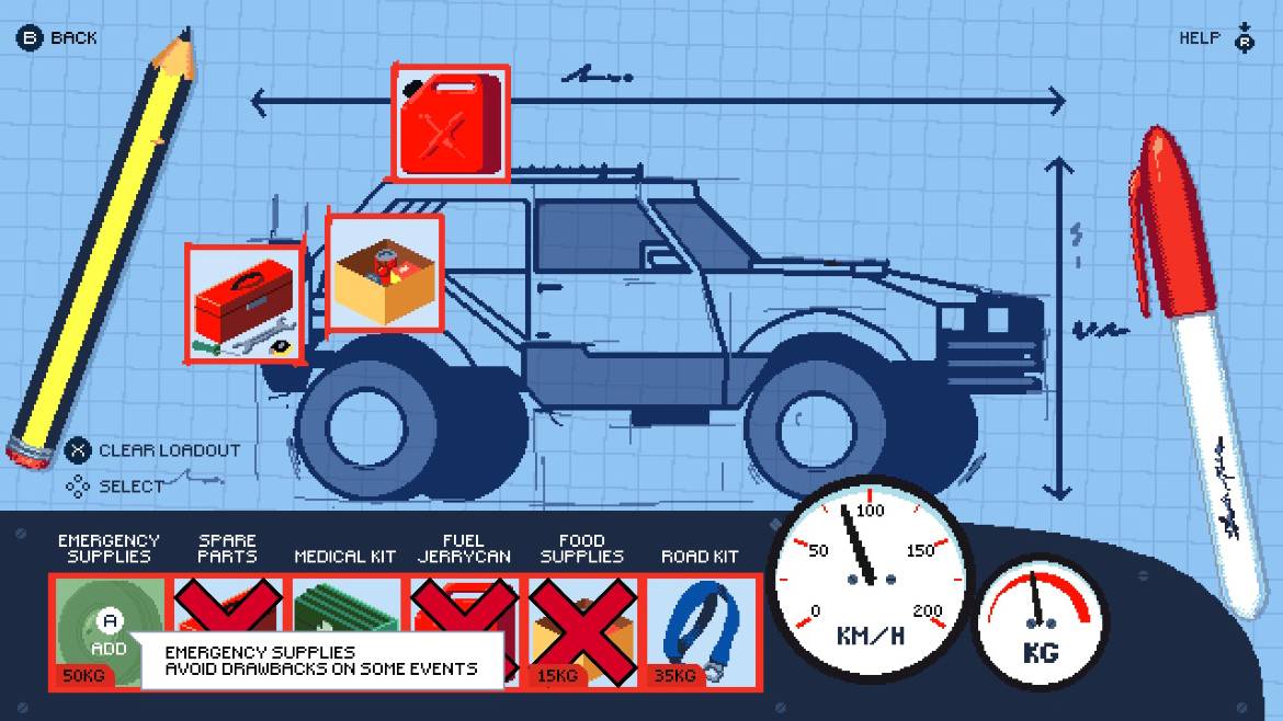 Därefter får jag packa bilen. Tre utrymmen finns, och sex olika tillbehör att välja bland. Dessa kan ge allt från extra bensin till mer mat eller fler reservdelar, men alla tillbehör påverkar bilens vikt och därmed däckslitage och bränsleförbrukning. Det är ett intressant system på pappret, men även här är djupet begränsat.