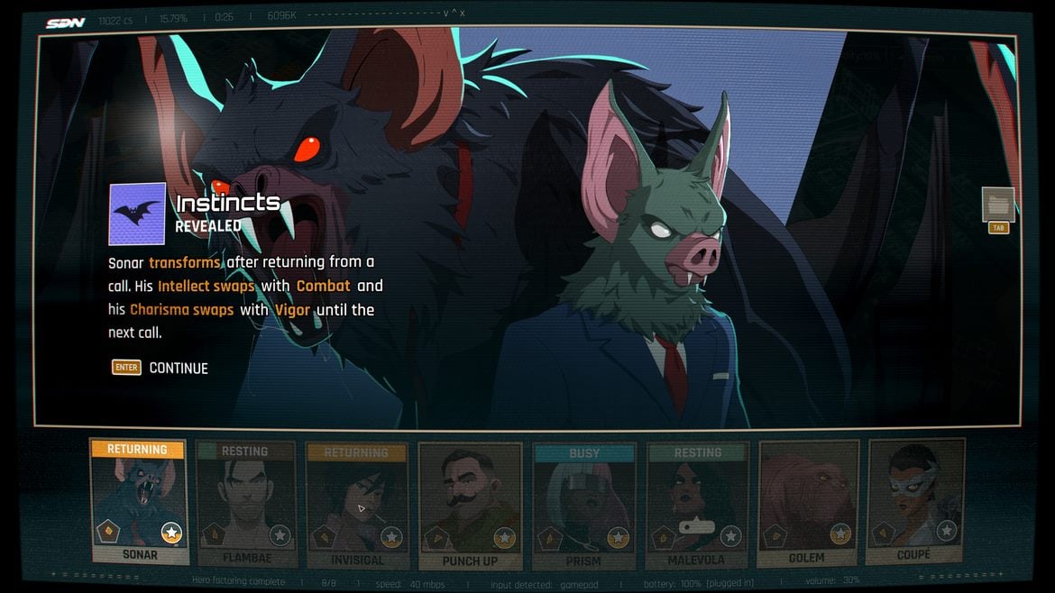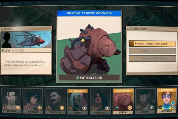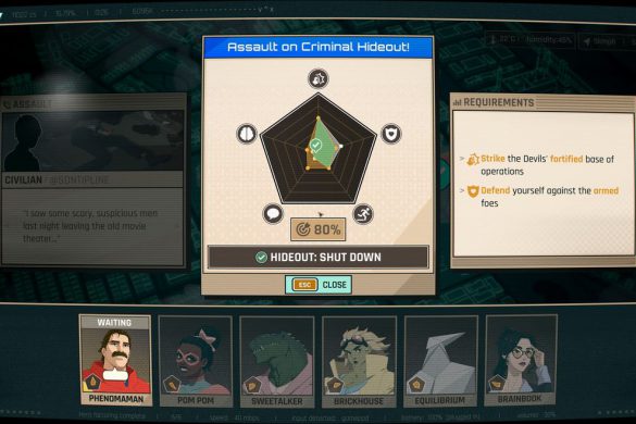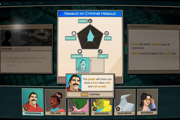 Olika uppdrag har olika många luckor där du kan sätta hjältar, vissa har en men de flesta har fler, om du skickar rätt hjältar kan de ha synergi med varandra och ökar därmed chansen att lyckas. Allt medan du skickar ut dem får de erfarenhet av lyckade uppdrag, när de levlar upp kan du placera ut poäng till attributen och blir starkare. Under tiden för de dialog med varandra samt dig vilket ger en känsla av att vara kollegor mer än något annat, och det funkar så jäkla bra. Detta är absolut det bästa med spelet för mig. Den påminner om 911 Operator då premissen är liknande och det funkar otroligt väl. Humorn samt de antingen banala eller allvarliga uppdrag du ställs inför skapar en unik känsla som jag behöver ett självstående spel med – NU!