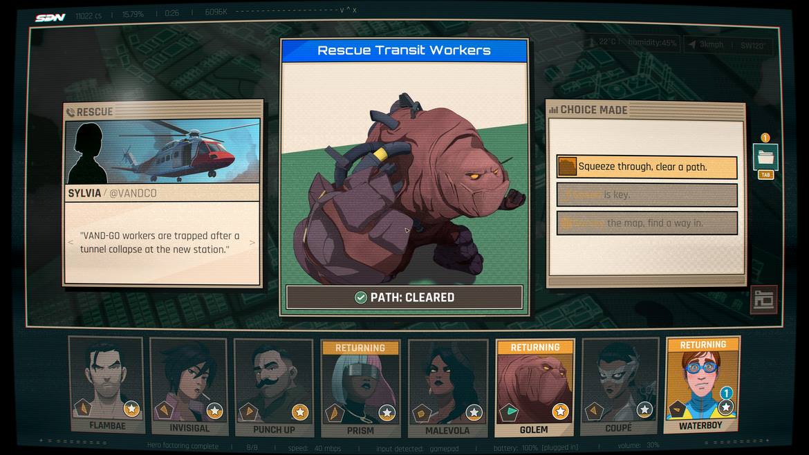 Olika uppdrag har olika många luckor där du kan sätta hjältar, vissa har en men de flesta har fler, om du skickar rätt hjältar kan de ha synergi med varandra och ökar därmed chansen att lyckas. Allt medan du skickar ut dem får de erfarenhet av lyckade uppdrag, när de levlar upp kan du placera ut poäng till attributen och blir starkare. Under tiden för de dialog med varandra samt dig vilket ger en känsla av att vara kollegor mer än något annat, och det funkar så jäkla bra. Detta är absolut det bästa med spelet för mig. Den påminner om 911 Operator då premissen är liknande och det funkar otroligt väl. Humorn samt de antingen banala eller allvarliga uppdrag du ställs inför skapar en unik känsla som jag behöver ett självstående spel med – NU!