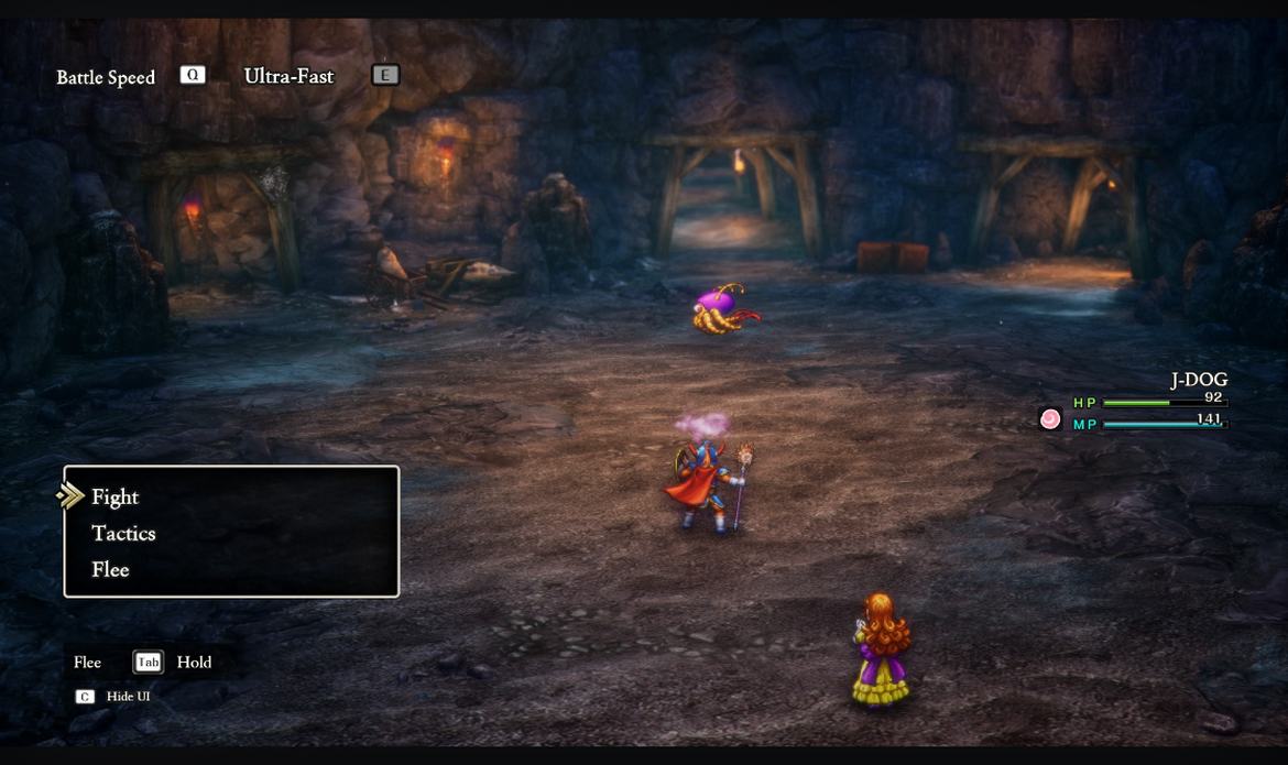 När det kommer till spelmekanik är Dragon Quest 1 verkligen klassiskt på alla sätt och vis. Vi rör oss på en stor sammanhängande världskarta, slåss mot monster, tar oss till byar där vi pratar med olika karaktärer som leder till att vi kommer till en grotta där vi på slutet får möta en boss och sedan fortsätter detta till spelets slut. Jag uppskattar att utvecklarna har lagt ut markörer på var man ska härnäst, även med uppdrag som gör det tydligt vad du ska göra. Om du är en purist kan du stänga av denna funktion. Det finns även svårighetsgrader att välja bland; Dracky Quest (lätt), Dragon Quest (medel) och Draconan Quest (svår), som öppnar upp möjligheter att skräddarsy sin upplevelse. På lättaste svårighetsgraden kan du även göra dig själv odödlig. Jag uppskattar alla dessa livskvalitetsfixar, men det är en aspekt jag verkligen inte gillar och det är att man inte kan stänga av Random Encounters. Om det är något jag har svårt för i klassiska rollspel är det just den funktionen. Här kan jag knappt gå tre meter innan en fiendevåg dyker upp, vilket drar ner tempot enormt och blir mer ett irritationsmoment än någonting kul. Flertalet andra remasters av klassiska JRPG:n har möjligheten att stänga av/på encounters, så varför inte här?