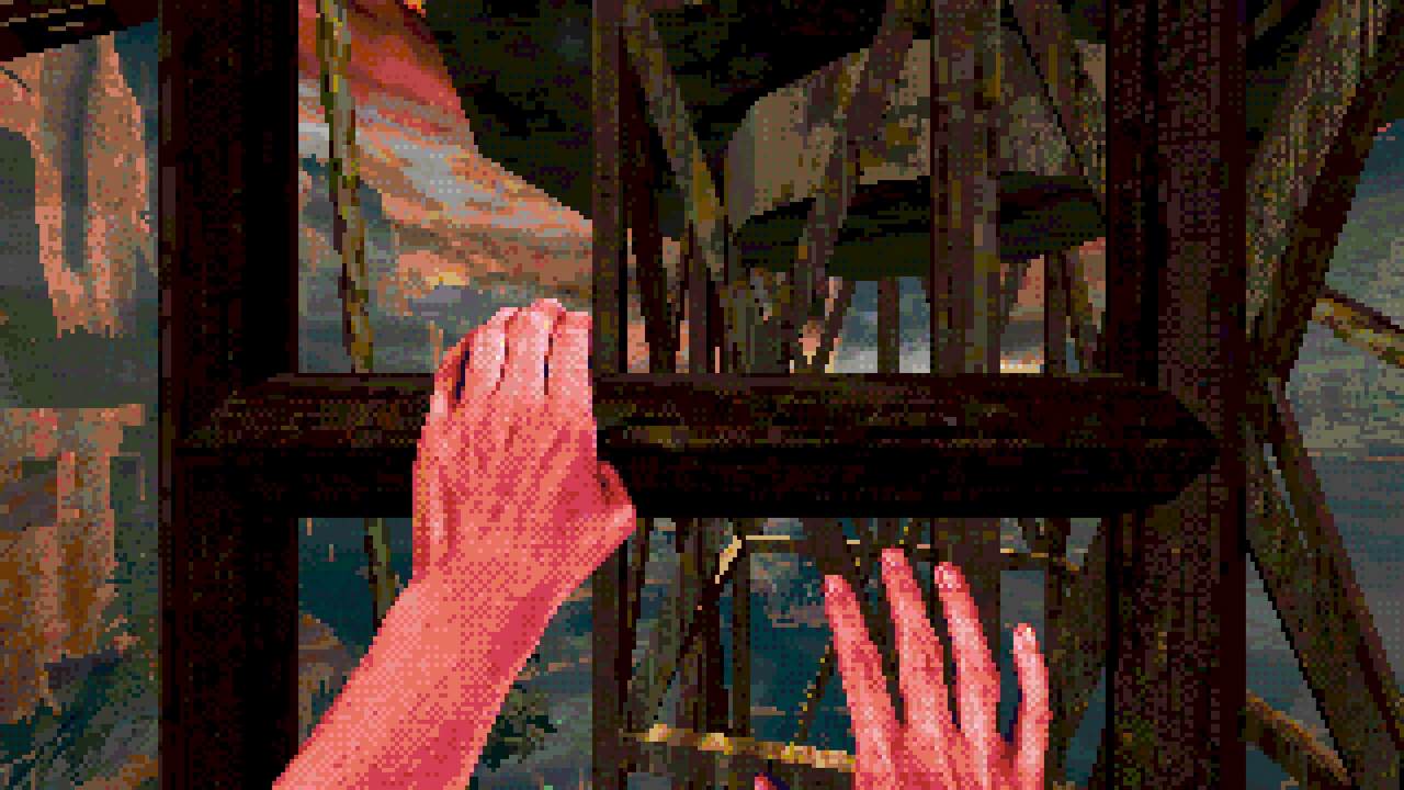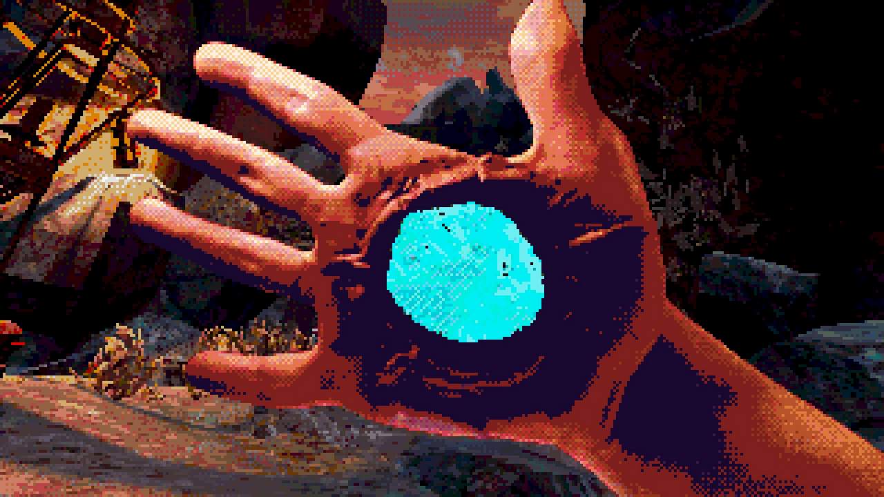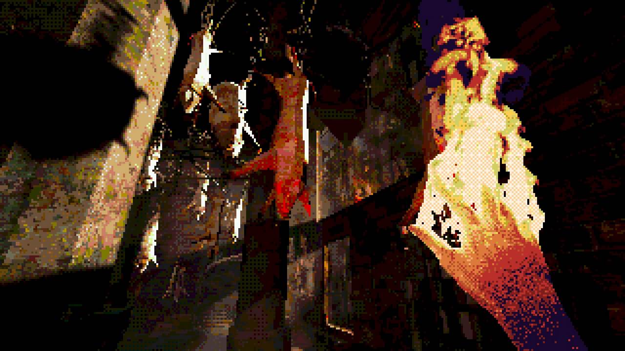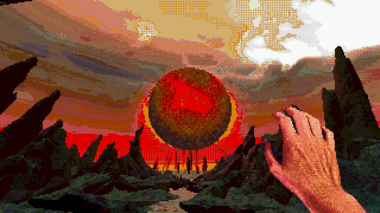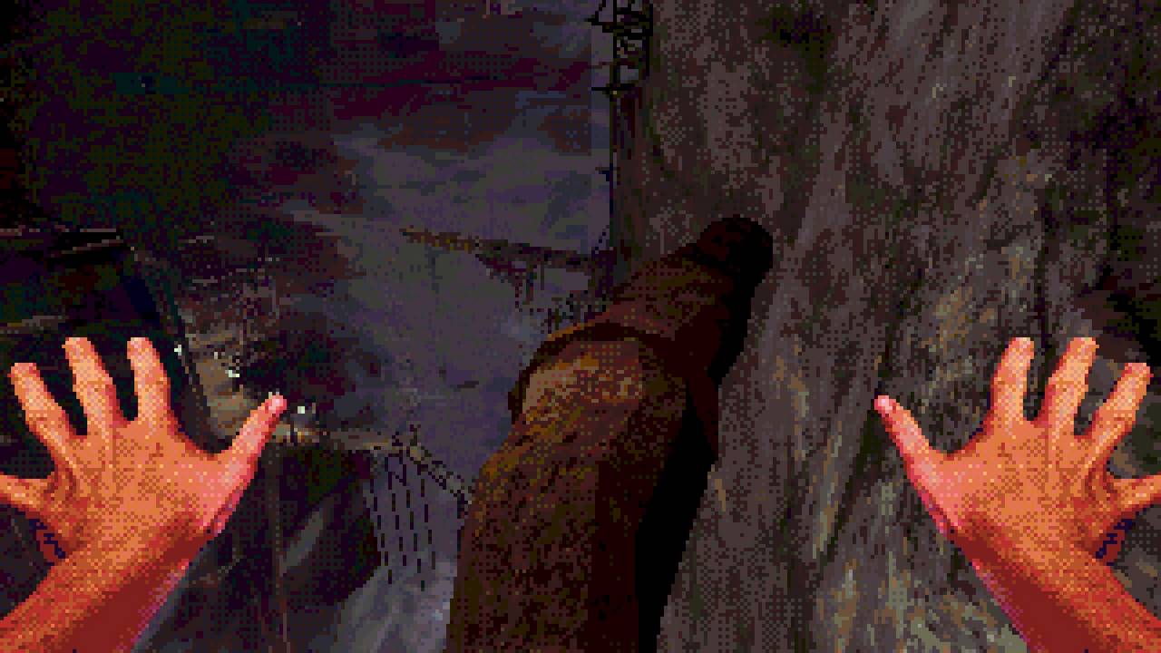 Estetiken är kanske det som fångat uppmärksamheten främst hos folk. I en tid med otroligt mycket retro-estetik bland spel lyckas Eclipsium sticka ut i mängden – på gott och ont. Vissa har fått huvudvärk av dithering– och pixeleffekterna. Som tur är går dessa att stänga av till stor del. Vad som dock stört mig, trots ett bra första intryck, är att estetiken mest känns som ett lager färg som inte fått torka ordentligt, målat ovanpå ett annat lager av ojämn färg. Antagligen är det inget de flesta kommer tänka på, men särskilt de olika typerna av dithering på världen och protagonistens händer petade mig rätt i ögat. Nu vet jag inte hur rätt eller fel jag har, men något står inte rätt till där. De matchar inte varandra, särskilt inte med tanke på att mycket i världen är 3D-modeller, medan händerna är digitaliserad video gjorda till 2D-sprites. Det skär sig helt enkelt på ett sätt som är svårt att förklara tills du själv lägger märke till det. Dessutom är vissa animationer lena som smör, medan andra hackar likt 90-talets begränsade bilduppdatering i revolutionerande 3D-spel. Båda är estetiska val, men, bestäm er för en konsekvent stil! Kalla det konstnärlig frihet om ni vill, men det är onekligen störande, ena stilen eller den andra hade funkat bra – bara allt var enhetligt.