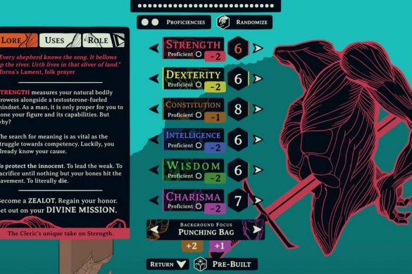 Det är väldigt lätt att dra paralleller till Baldur´s Gate, dels på grund av fantasy-temat, men också på grund av den synliga rollspelsaspekten. Vi har ett karaktärsblad, där du ser dina färdigheter sorterade efter Strength, Dexterity, Constitution, Wisdom, Intelligence samt Charisma. Innan spelet ens börjar får vi fördela poäng på dessa färdigheter utefter vad du känner att du vill vara bra på. Under spelets gång kommer vi tjäna färdighetspoäng, för att göra dessa förmågor starkare.