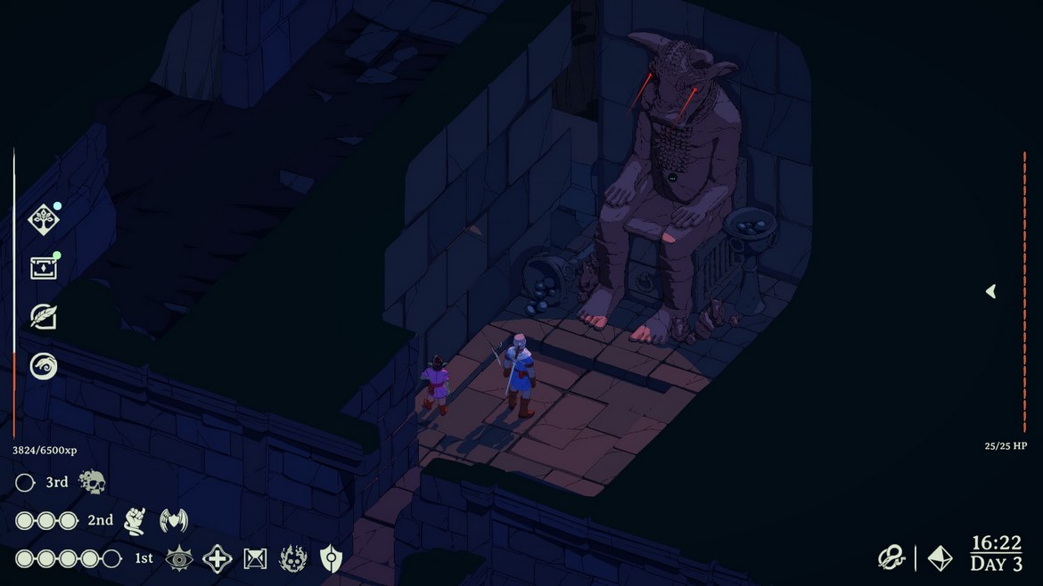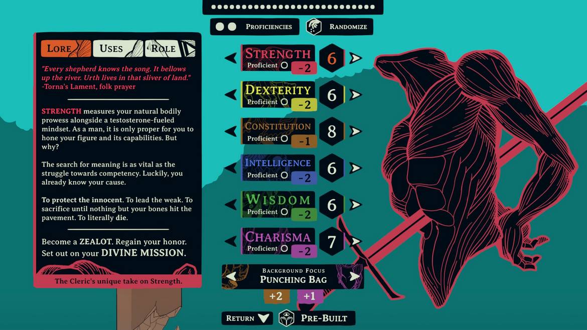 Det är väldigt lätt att dra paralleller till Baldur´s Gate, dels på grund av fantasy-temat, men också på grund av den synliga rollspelsaspekten. Vi har ett karaktärsblad, där du ser dina färdigheter sorterade efter Strength, Dexterity, Constitution, Wisdom, Intelligence samt Charisma. Innan spelet ens börjar får vi fördela poäng på dessa färdigheter utefter vad du känner att du vill vara bra på. Under spelets gång kommer vi tjäna färdighetspoäng, för att göra dessa förmågor starkare.