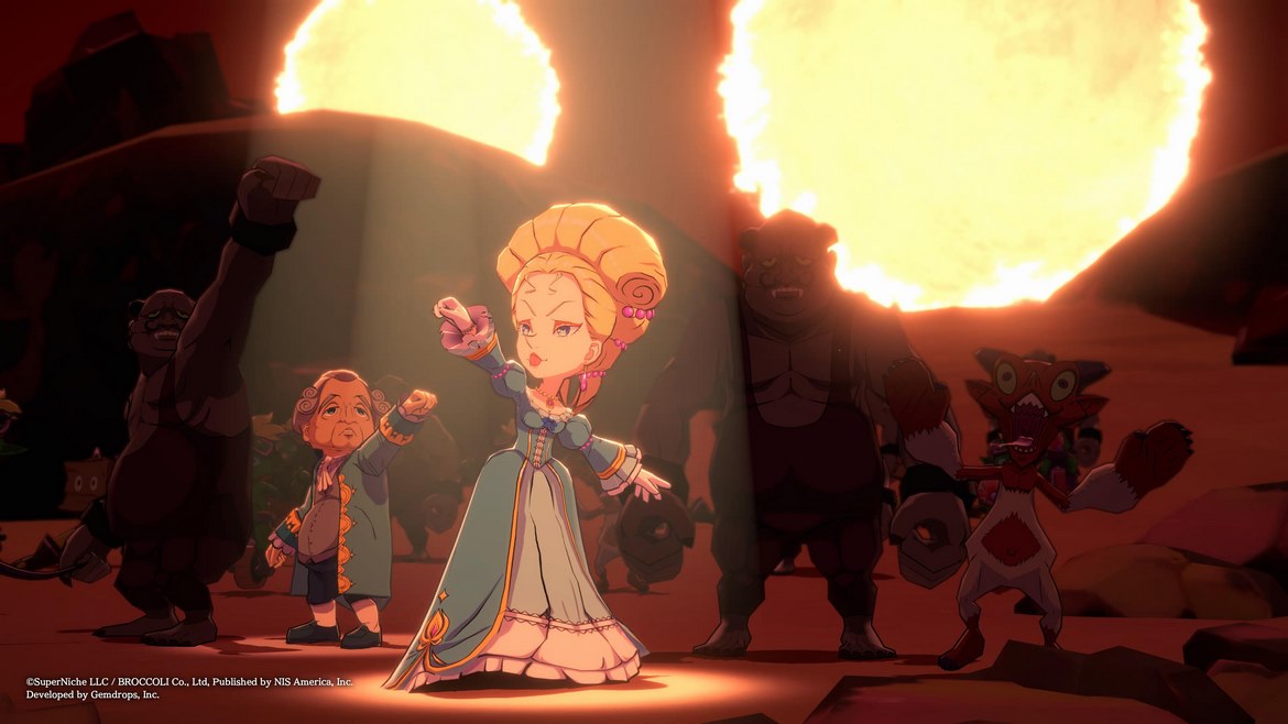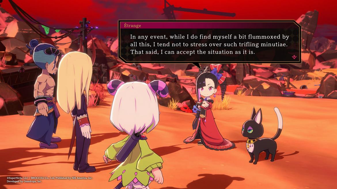 Läsaren har säkert redan här anat en mörkt ironisk ton i spelets historieberättande, och det är helt korrekt. Det här är ett dråpligt och ofta fånigt spel som inte riktigt tar sig på det blodiga allvar som vissa andra japanska RPG:n kanske gjort med samma förutsättningar. Och det här är ju affärsverksamhet precis som på vilken tisdag som helst för utvecklaren Nippon Ichi Software (hädanefter kallad NIS) Det här är inte första (inte heller den sista) gången NIS har producerat ett spel kring helvetet, demonherrar och livet efter detta, och mycket riktigt är spelet skrivet och designat av Sohei Niikawa, skaparen av den omtyckta Disgaea-serien. Storyn är lättsam, komisk och ofta även satirisk kring många idéer kring religion. Det är ändå tillräckligt harmlöst för att vem som helst ska kunna uppskatta spelet. Samtidigt bryts den fjärde väggen regelbundet, då Etrange ofta kommenterar hur hennes RPG-stats ser ut genom att konsultera sin egna statusskärm.