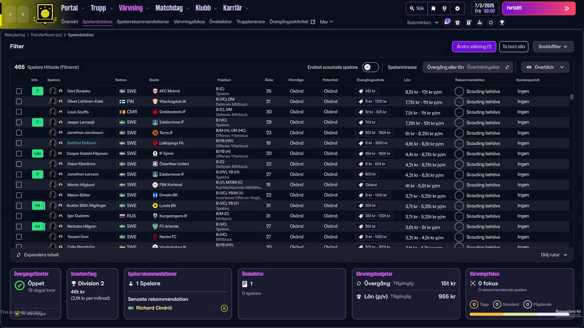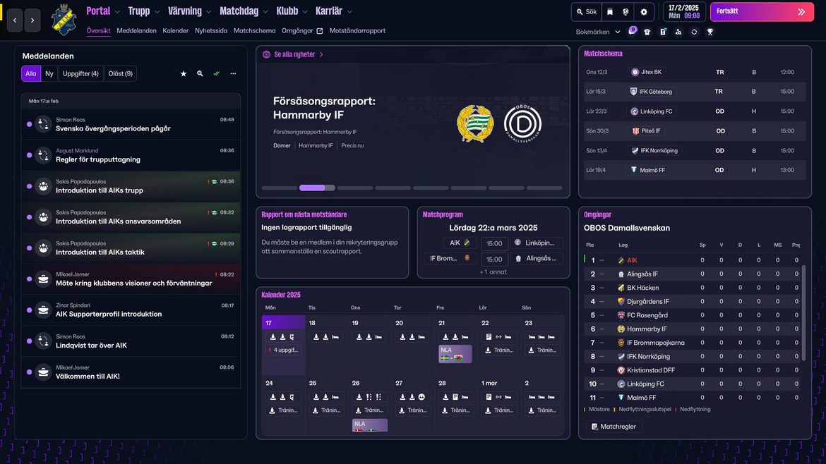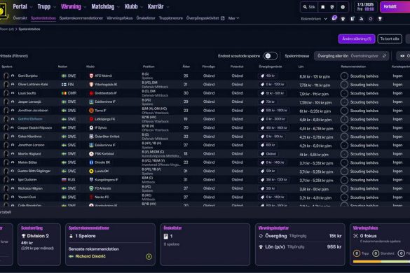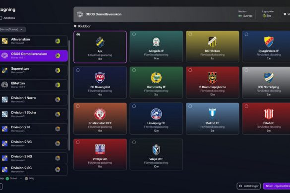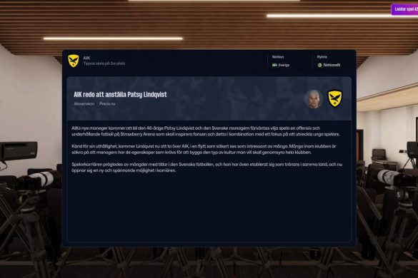 Det finns också några saker som jag stör mig på extra mycket. En del översättningar försvinner, till exempel när jag är manager för ett herrlag står det ändå ‘henne’ i översättningarna. I herrallsvenskan är det tydligen notoriskt svårt att få in klubbmärken, men inte i damallsvenskan. Om det nu bevisligen finns klubbmärken att använda sig av, varför gör de inte det då? När det gäller musik och ljudbild är den… obefintlig. Det finns noll musik i spelet. Matcherna har sin klassiska publikbakgrund och när bollen slås till, men det låter som att någon kastar en medicinboll i en gymnastiksal. Alldeles för mycket reverb för att det ens ska kunna tas på allvar. Det som störde mig mest var hur spelet kraschade nästan varje gång jag satte igång youtube i bakgrunden. Det hände inte med Spotify eller någon annan sida utan bara youtube. Irriterande och supermärkligt. Här finns det alltså en hel del poäng för Sports Interactive att plocka. När det gäller uppdateringar är det enda jag vet att de valt att släppa spelet utan en så kallad day one patch som de flesta spel slänger sig med nuförtiden.
