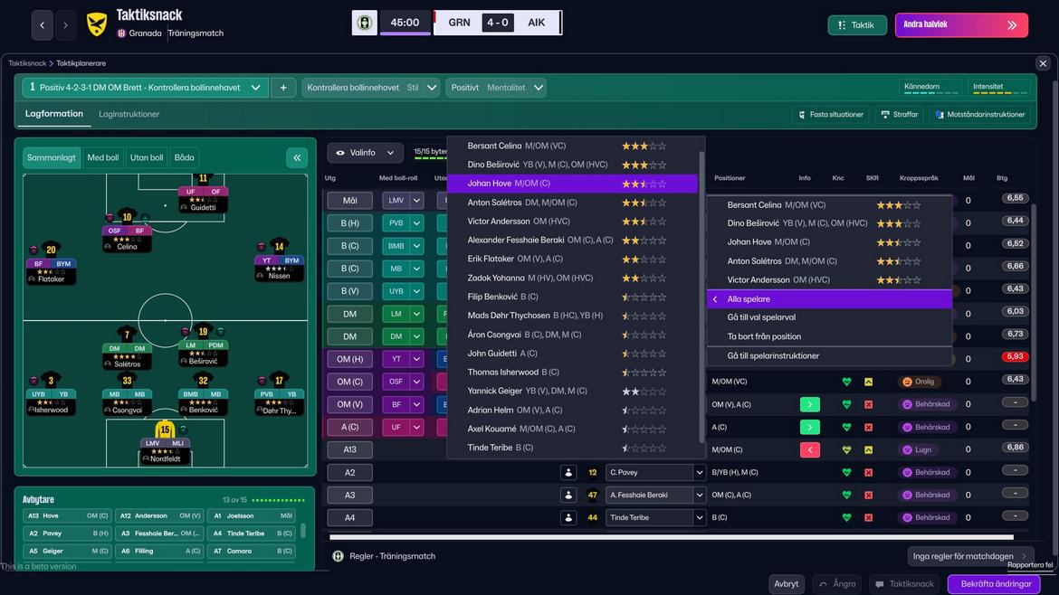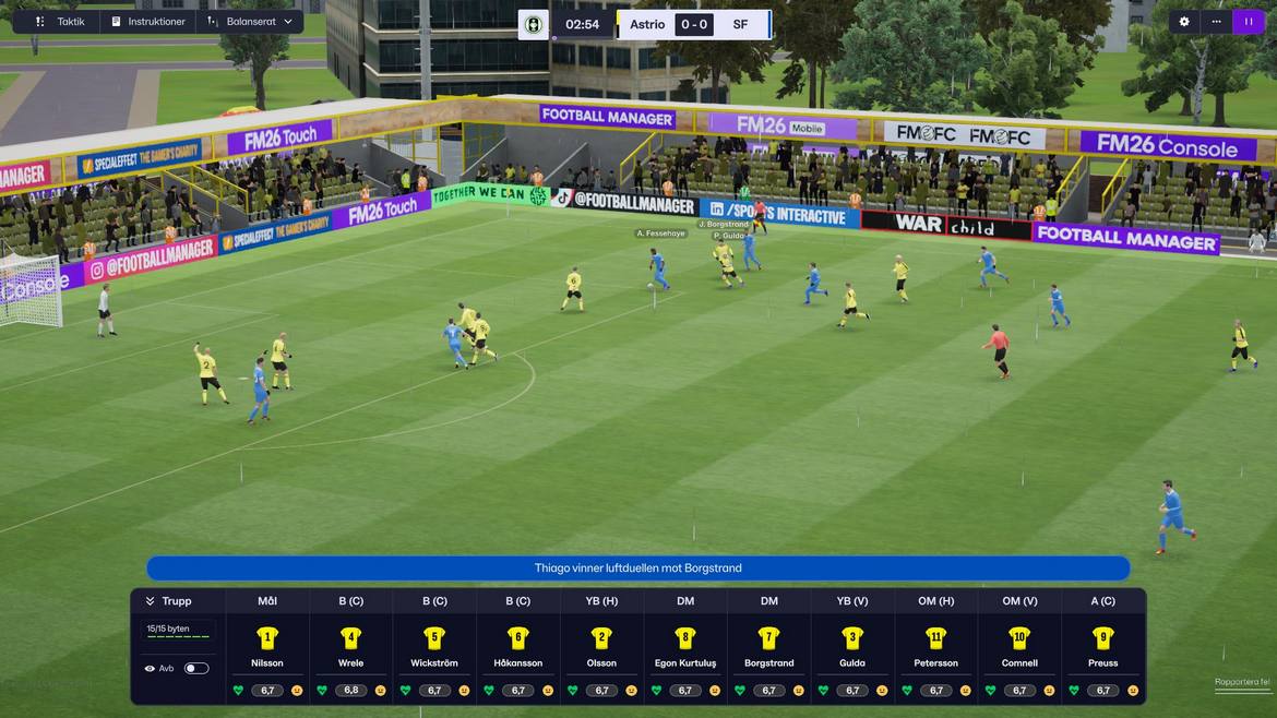 AI:n i matcherna har fått en ordentlig uppgradering, men det betyder också att motståndarna tänker snabbare – ibland lite för snabbt. Taktiska justeringar som brukade funka förr känns plötsligt ineffektiva, vilket både kan ses som en styrka och en källa till frustration. Du måste verkligen förstå fotboll nu. Att bara byta till “Gegenpress” (att pressa tillbaka en motståndarpress) och hoppas på det bästa, funkar inte längre. Det här spelet kräver att du analyserar, lär dig, anpassar dig – vilket i sig är imponerande, men kan skrämma bort mer avslappnade spelare. Om jag inte minns fel, pausades de gamla spelen när du skulle göra taktiska byten, plus att de genomfördes direkt. I FM26 måste du pausa manuellt om du vill slippa stressen med att tiden går när du tar beslut. Däremot gillar jag att det inte implementerar din taktik förrän vid avblåsning.