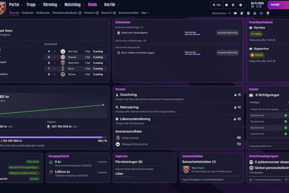 Redan vid första anblick märks det att FM26 är ett steg bort från sin trygga mall. Gränssnittet är renare, mer strukturerat, men också mer påträngande i sin mängd information. Sports Interactive har pratat mycket om “clarity and depth” inför årets släpp, och det märks att de velat ge spelaren en bättre överblick. Det är lättare att se vad som påverkar lagmoral, träningsbelastning och ekonomi, men det kräver också mer aktivt tänkande. Där FM24 kunde flyta på med rutin, känns FM26 mer som att sitta i förarsätet på en komplex maskin – du har mer kontroll, men också mer ansvar.
