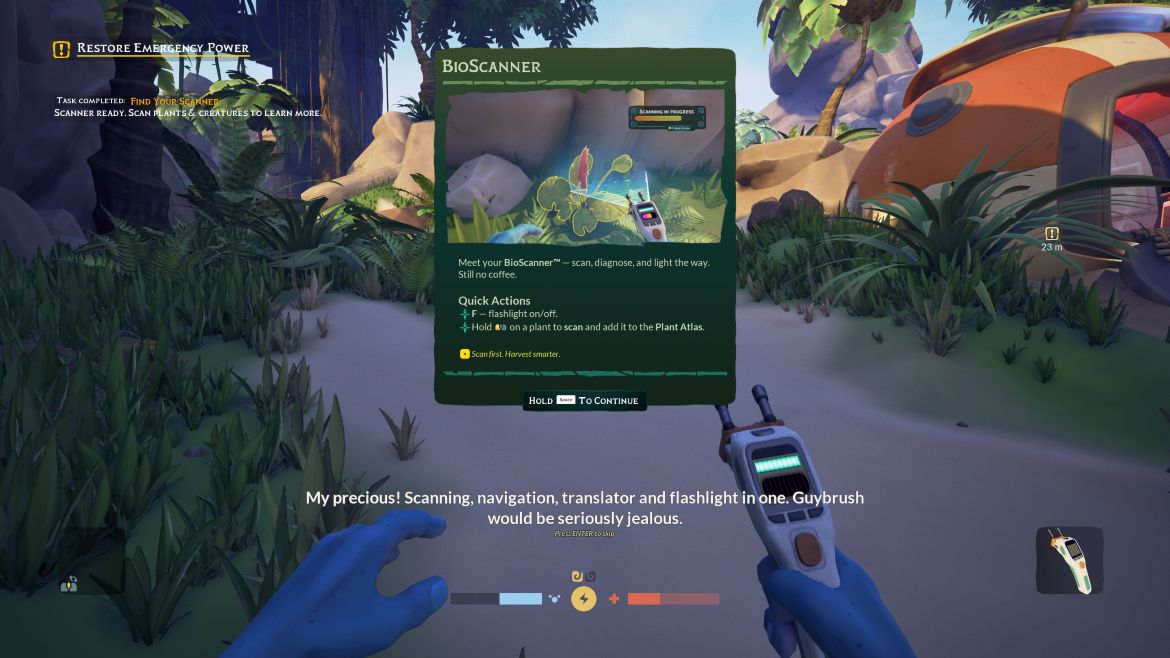 Spelmekaniken är en förenklad form av överlevnad som till största del, just nu ska jag tillägga, går ut på att scanna och experimentera fram för att bygga upp min bas. Med tiden förvandlas mitt läger till en bas med allt som är tillgängligt i spelet. Jag har fixat odlingar, förvaringslådor, byggstationer och ett litet hus i anslutning till mitt kraschade skepp, men jag ser potentialen då många av sakerna är låsta så ser jag vad som kommer när väl spelet är släppt i sitt fullo.