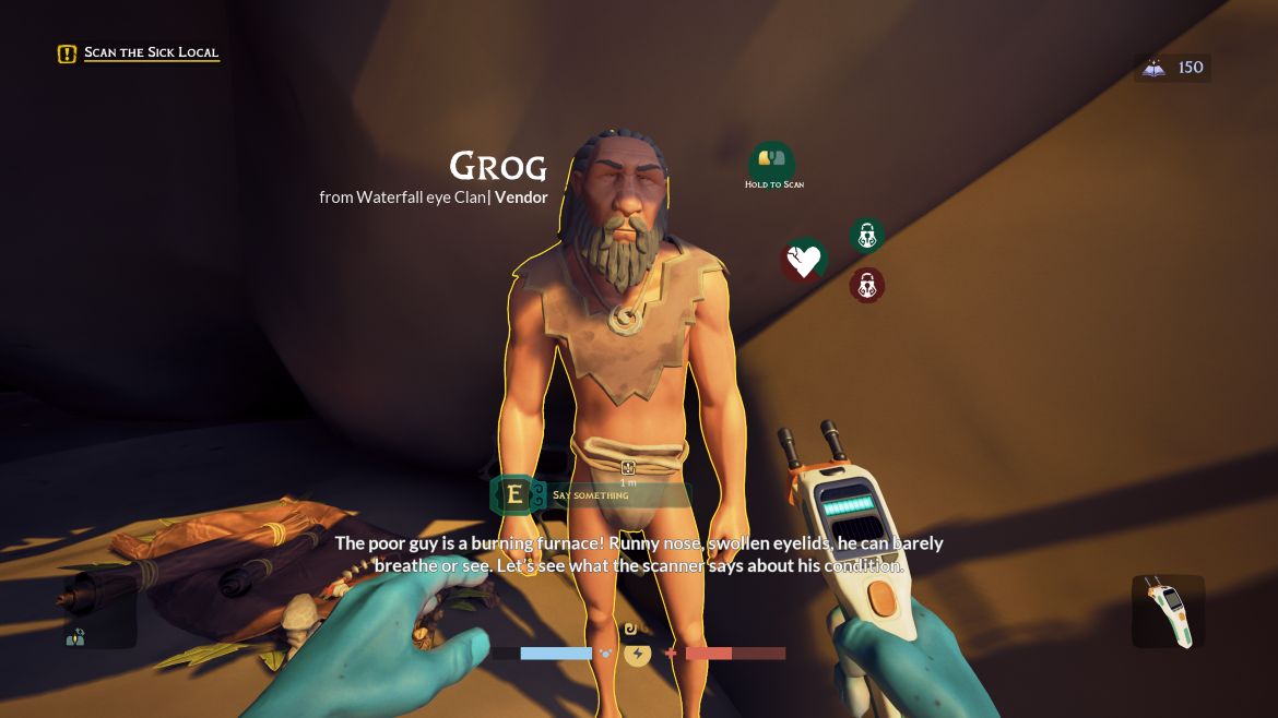 Eftersom spelet utspelar sig för cirka 300 000 år sedan får jag sällskap av neandertalare. De är nyfikna men skygga, och en stor del av charmen ligger i att vinna deras tillit. Genom att använda min scanner kan jag identifiera deras sjukdomar och ta fram exakta recept på växtbaserade elixir för att hjälpa dem. När jag helar dem belönas jag med verktyg, förnödenheter och allierade. Jag kan visa en neandertalare en resurs, säg en bit flinta. Om min relation till denna person är tillräckligt bra kommer hen samla just den resursen åt mig.