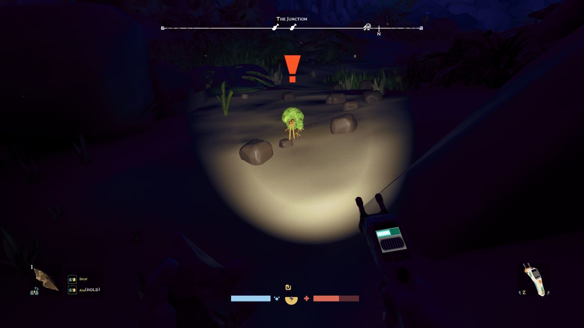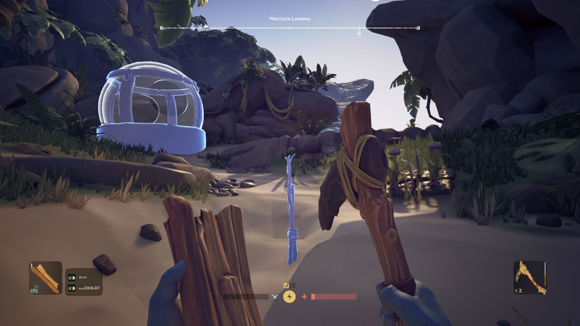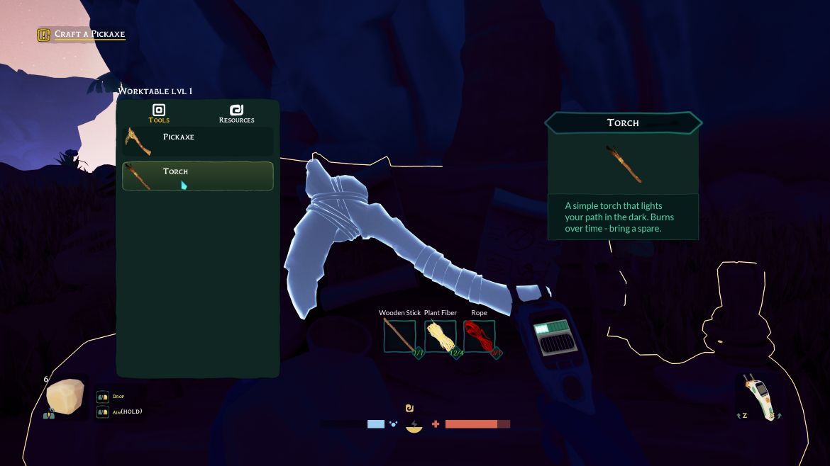 Visuellt är spelet däremot en fröjd. Stilen är mer ”Disney” än realism, med mjuka färger, fantastisk ljussättning och en dygnsrytm som gör nätterna genuint mörka. Som tur är kan jag tillverka facklor och min scanner har en ficklampa, dock med begränsad batteritid. Biomerna jag stött på var djungel, strand och grotta men det ska finnas en större variation när spelet blir klart samt en co-op funktion som inte finns i dess nuvarande form.