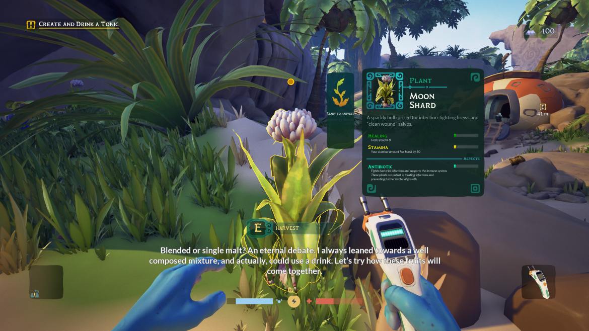 Spelets kärna och det ultimata målet med vistelsen på denna planet är min botaniska kunskap, den är helt avgörande för att jag ska överleva här. Jag måste lära mig att förädla jordens flora till både mat och medicin, samtidigt som jag letar efter växtarter som kan frodas på min hemvärld. Det mest akuta är dock att odla de örter som krävs för att säkra den tillgång på koldioxid jag behöver för att kunna andas. Jag har bara två staplar att hålla reda på, en koldioxidmätare och hälsomätare. Till min hjälp har jag en scanner som bland annat låter mig identifiera varelser och växter. Jag har ett portabelt bevattningssystem som kräver att jag fyller på den med vatten ibland men den är livsnödvändig för att bibehålla god kvalitet på odlingen. Sedan har jag en sorts hammare, det är den som öppnar upp byggmenyn och låter mig påbörja basbyggandet.