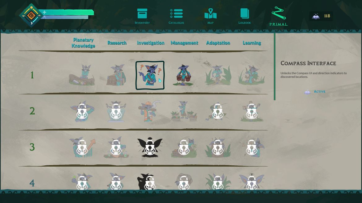 Världen är full av djur, allt från små krabbor till mammutar jäms med neandertalarna. De flesta är inte aggressiva, men de äter gärna upp mina odlingar om jag inte hägnar in dem. Jag kan även tämja djuren så att de hjälper mig, exempelvis genom att hämta frön från fjärran platser. Mina egna färdigheter utvecklas via ”P.R.I.M.A.L.”-trädet, som står för: