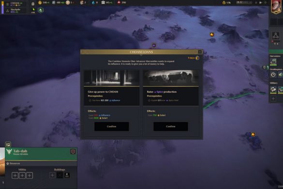 Spelmässigt styr du därför dina enheter genom att annektera olika fördefinierade områden på Arrakis karta, och försöker sedan utvinna vad du kan från var och ett av dessa. Väldigt få har nämligen krydda och kan istället användas för att utvinna fukt ur luften och därmed ge dig vatten, eller bara skapa metaller. För detta behöver du först ta över varje regions stad och därefter kan du producera upp till fem byggnader fokuserade på olika saker till fördel för ditt rikes utveckling. Det kan vara byggnader inom tre områden (utveckling, försvar eller ekonomi) – vilket innebär att du behöver göra viktiga val. Du behöver nämligen (precis som i exempelvis Civilization) balansera produktionen så du hela tiden är på plussidan för de resurser du behöver (vilket även innefattar människor), men samtidigt leverera krydda till Kejsaren och samla in så kallade Hegemony poäng. Dessa poäng är vad som ger dig extra fördelar (de representerar din favor hos Kejsaren som jag förstår det), och möjliggör ytterligare upplåsning av fördelar i form av alliansfördelar och ekonomisk vinning.