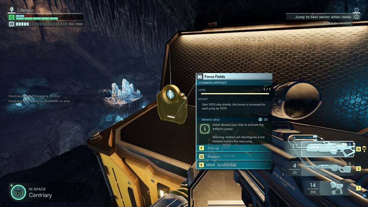 När du rör dig utanför skeppet kan du hitta olika objekt som hjälper dig på vägen, ibland är det vapen, reperationskit, sköldladdare eller första hjälpen – ibland är det artefakter. Dessa buffar er och ert skepp på olika vis beroende på vilken artefakt ni hittar. Det kan vara att ni gör mer skada när era sköldar är nere eller att ni får sköldar för varje hopp ni gör. Allt som ligger i skeppet när ni klarat ert uppdrag konverteras till krediter och ”salvage” utom artefakterna som förstörs när ni hoppar om de inte sätts i skeppets moduler. Ni kan sen uppgradera de olika delarna på skeppet för att göra dem allmänt bättre på olika sätt. Förutom att uppgradera de skeppsdelar ni redan har kommer ni hitta nya versioner av dem. De kan i generatorns fall vara att du får färre energi rutor som du kan sätta skeppets olika system i, men fler rutor som inte kan påverkas och slås ut. Delarna kan bytas relativt fritt och hur många av de olika delarna ni kan ha påverkas framförallt av vilket skepp ni flyger runt i. Alla olika delar av en viss sort funkar på alla skepp, det är huvudsakligen hur många platser skeppet har tillgängliga för dem som avgör.
