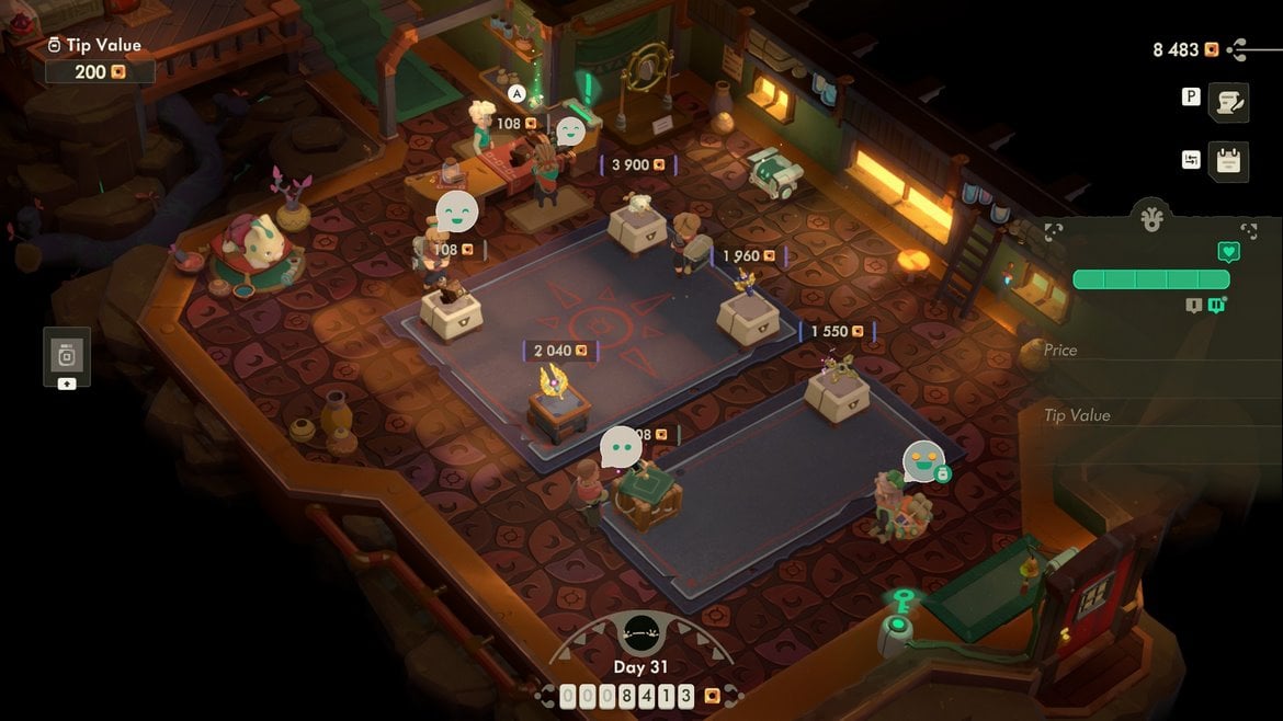 När vi väl återvänder hem till Tresna kan vi börja sätta upp alla dessa på piedestalerna, bestämma dess pris och sedan är det bara att öppna affären! In trillar det bybor som intresserar sig för dina varor, men beroende på pris kan de reagera enligt fyra bestämda reaktioner – Arg (overpriced), Missnöjd (expensive) glad (perfect sell) och exalterad (cheap sell). Om du lyckas träffa precis rätt med perfect sell ökar även en liten mätare som ger dig förmåner, likt banorna, men dessa påverkar din försäljning istället för strid. Det kan vara att vi får lite mer dricks efter varje köp, eller att rare-objekt säljer dyrare. När vi stänger för dagen kan vi räkna ihop all vår vinst, därefter är det dags att uppgradera!