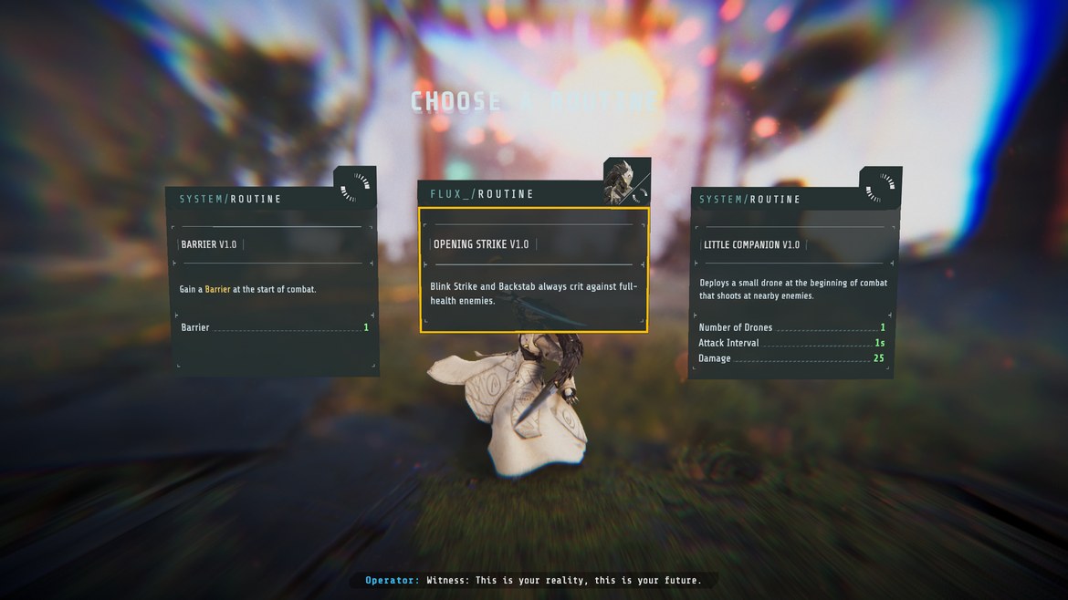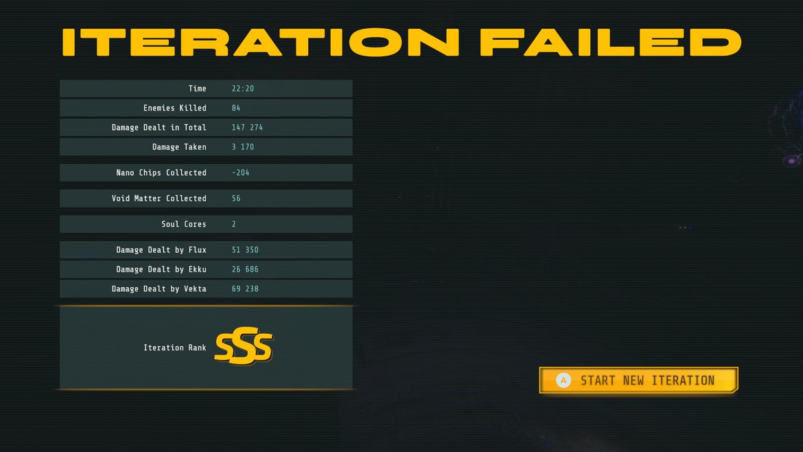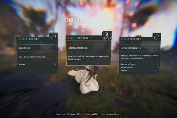 Uppgraderingssystemet känns väldigt robust, dock lite förvirrande till en början, men jag lärde mig fort vad jag skulle fokusera på för att få den mest optimala omgången. De vanliga förmågorna och specialförmågorna går att byta ut, dessa går att finna under varje omgång undangömd i världen. Vid ett senare tillfälle kan du även låsa upp vilka specialförmågor eller vanliga förmågor du vill börja med. Varje karaktär har “routines” eller rutiner som erbjuder passiva förbättringar och det finns universella rutiner som appliceras på alla karaktärerna. Till en början kan du enbart använda fem av dessa rutiner per karaktär utöver de fem som finns som universella, så tjugo rutiner allt som allt. Det går att uppgradera så du kan ha fler rutiner, vilket fördjupar spelstilen ytterligare. Dessa rutiner kan göra att Vektas kaststjärnor studsar mellan fienderna, att attackdrönare flyger efter en, eller att Flux ”back stab” får den att hoppa mellan fiender.
