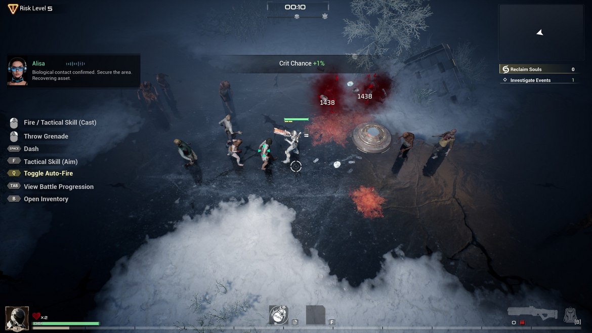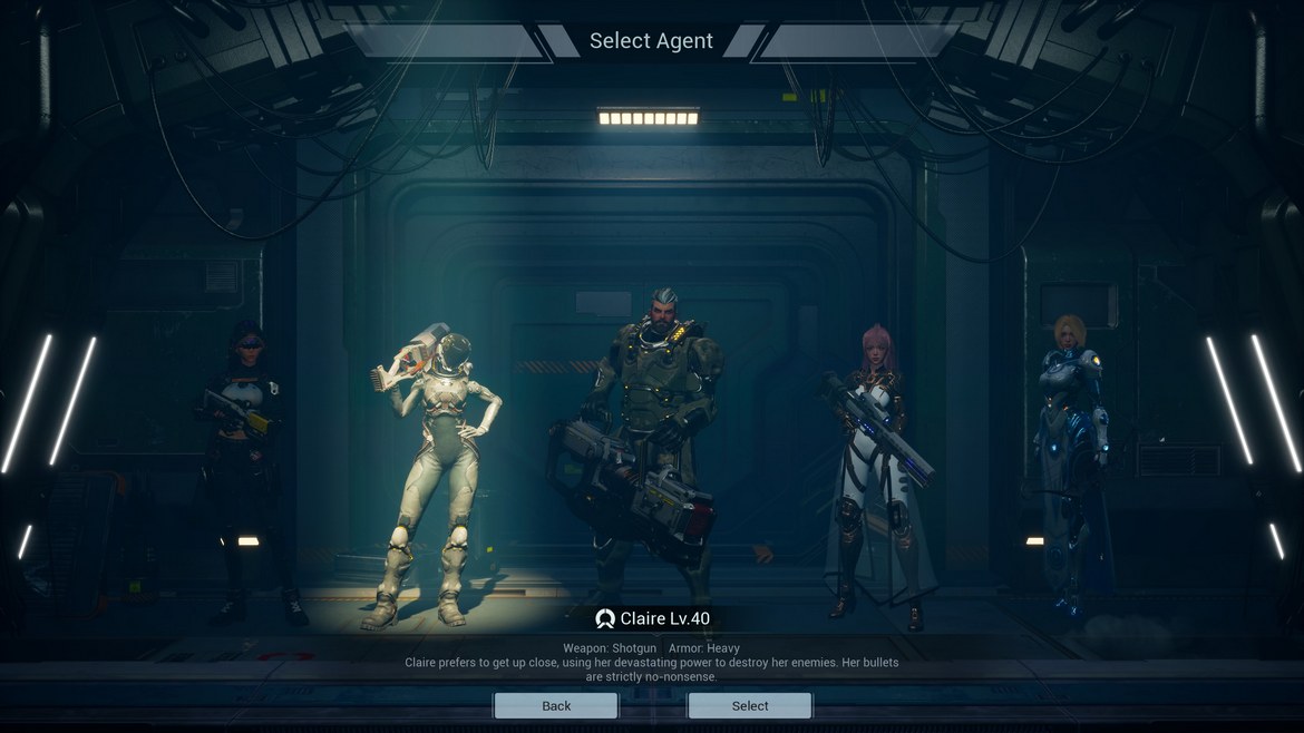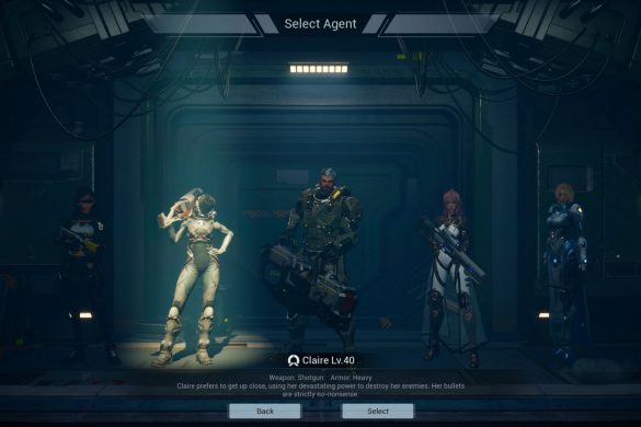 Ett enkelt upplägg alltså rent spelmekaniskt. Ta dig ut på fältet, skjut för glatta livet, uppgradera dina förmågor under spelomgången – och klarar du en hel spelomgång får du erfarenhetspoäng du kan sätta i karaktärens ”talent-tree”. Denna når du enbart utanför själva spelomgången i den väldigt spartanska spelhubb som karaktären befinner sig i mellan omgångar. Här kan du även sälja vapen du funnit, göra modifikationer, få extrapoäng om du klarat delmål samt byta mellan de fem karaktärer som spelet än så länge har tillgängliga. Har du blivit sugen än?
