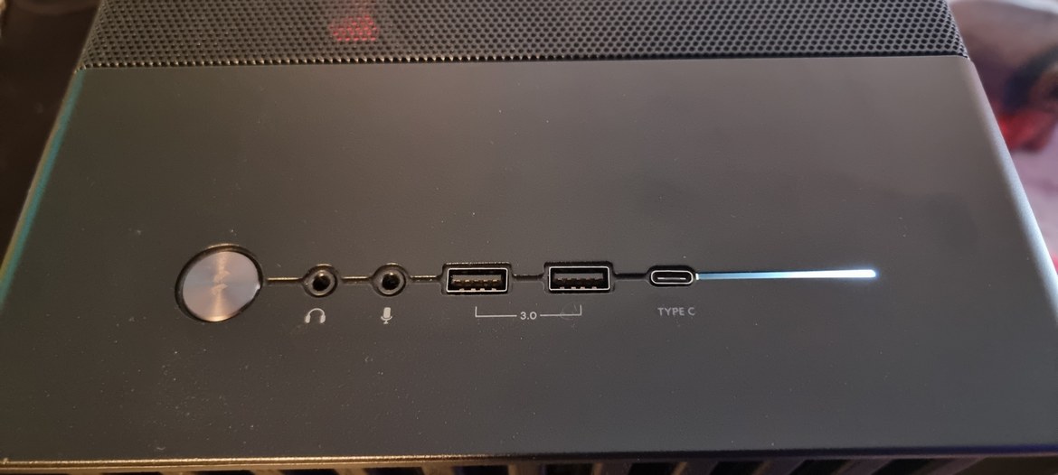 Frontpanelen är precis så välutrustad som man kan förvänta sig i den här prisklassen. Här finns USB-C (USB 3.1 Gen 2), två USB-A-portar samt en kombinerad ljud- och mikrofonkontakt. Inget överflöd – men inget som saknas heller. Inget överflöd – men inget som saknas heller.