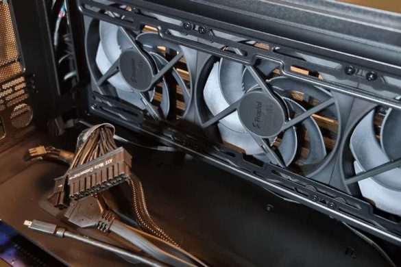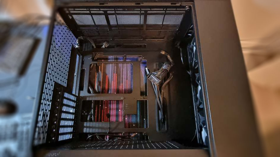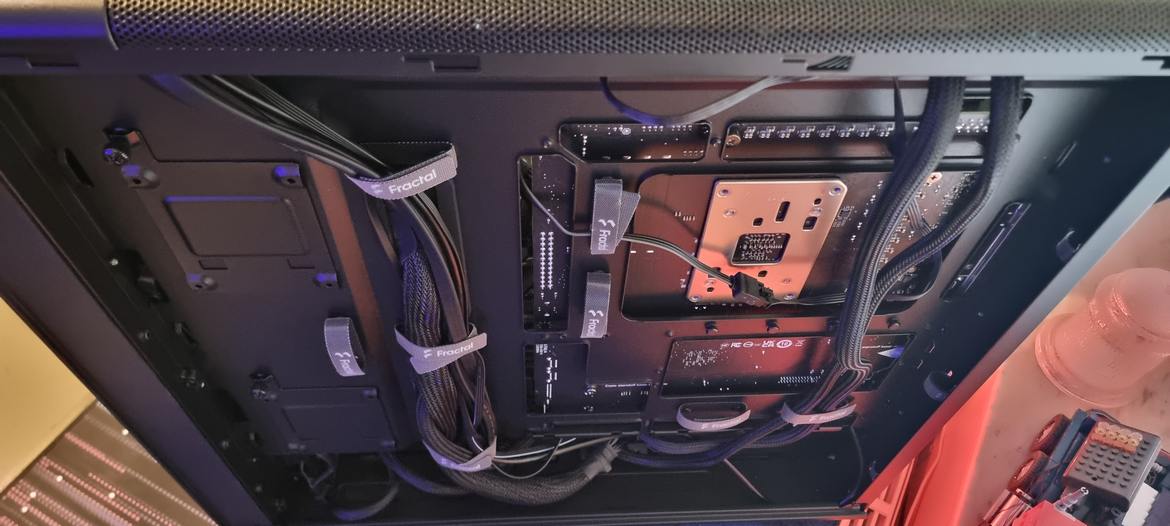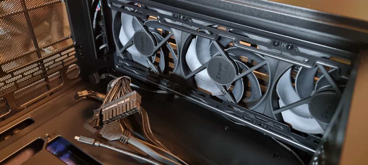 Invändigt märks det tydligt att Momentum XL är en vidareutveckling snarare än en kosmetisk uppdatering. Layouten är avskalad och logisk med gott om utrymme bakom moderkortsplåten och förbättrad kabeldragning. De cirka 29 mm som finns tillgängliga på baksidan gör stor skillnad i praktiken och bidrar till en smidig och stressfri installation. Samtidigt är avsaknaden av evolution något jag stör mig på lite grann. Fler gummiförsedda håligheter ut mot moderkort hade inte skadat – eller egentligen vilken annan större förändring som helst för att göra insidan mer estetisk tilltalande. Samtidigt är denna minimalistiska och pragmatiska design något Fractal bankat på, så i slutänden finns det inte mycket att gnälla över här.