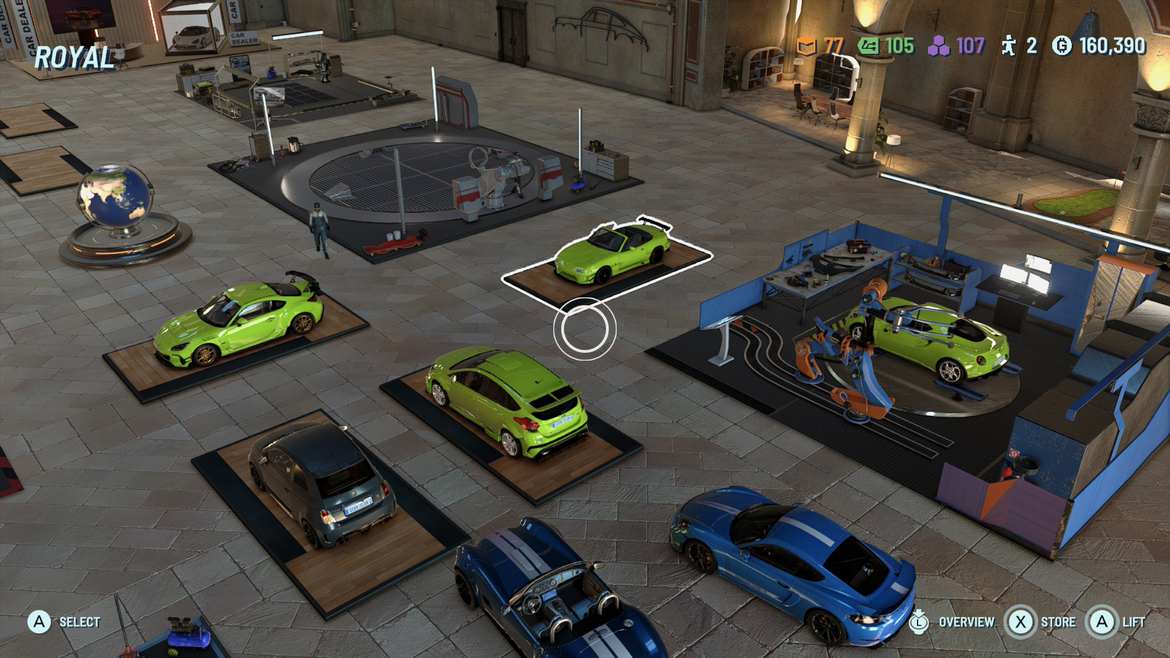 - Verkstad/Avdelningar: Progression i story-läget låser upp nya delar av verkstad som däckverkstad, vindtunnel och neon/pimp-avdelning. Dessa ska vi placera ut i vår verkstad efter eget tycke. Vi navigerar runt i verkstaden med kontrollen i en asymmetrisk vinkel. Detta känns lite omständligt och onödigt, låt oss uppdatera och att saker placeras ut automatiskt.