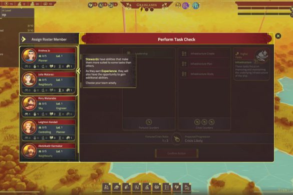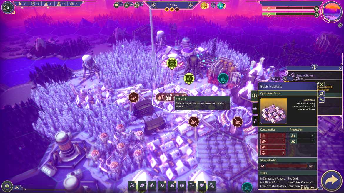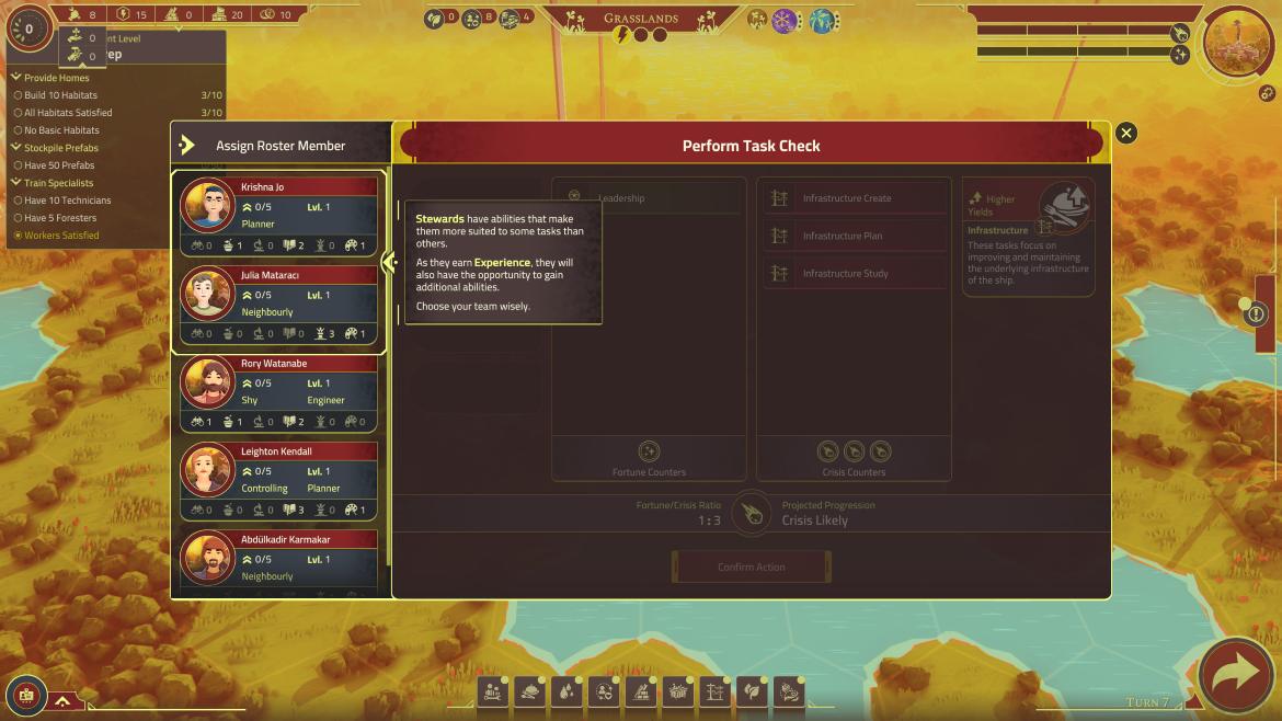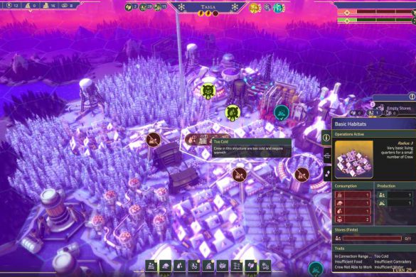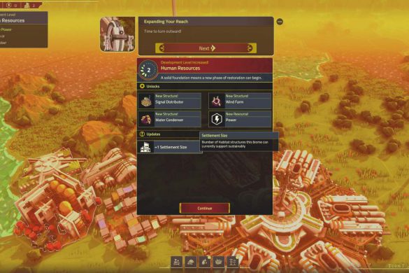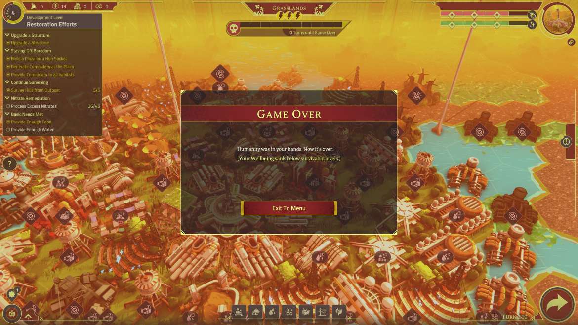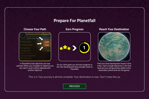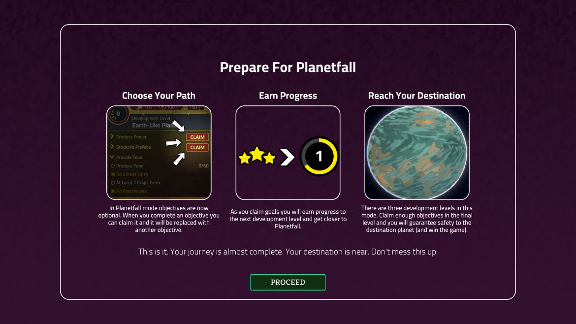 Spelet lider också av allvarliga prestandaproblem. Krascher och uppdrag som slutar ladda vidare gör att jag ofta tvingas ladda om gamla sparfiler. Det finns även en gräns för hur mycket spelet klarar av. Jag tror att målet med spelet är att göra en självförsörjande bosättning, se till att bosättningen klarar av resan till en ny planet – med minsta möjliga inverkan från mig. När jag väljer Planetfall-läget, som är spelets huvudläge och det läge där jag får spela på riktigt utan handhållning, så berättar spelet att jag snart är framme. Överlev! Jag kan säga att det resan mot slutmålet inte baseras på rundor, vilket en lätt kan tro om du ser på trailern till spelet. Där de nämner att ”Tiden tar slut”, tänker då att det är metaforiskt för mänskligheten då inget i spelet går på tid eller på rundor. Under en spelsession byggde jag ihop en bosättning med folk som arbetade, fick mat, vatten och el samt en avfallsstation som inte förorenade och började klicka “Avsluta runda”.