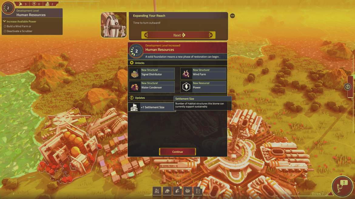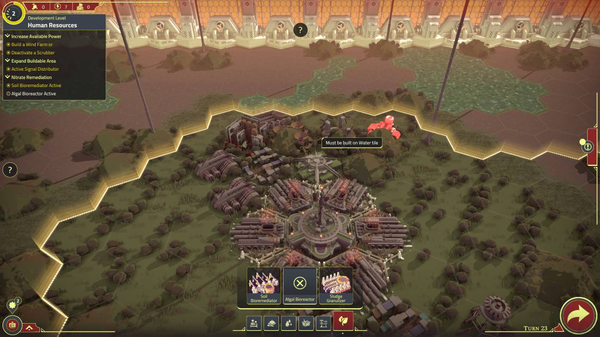 Ett av de största logistiska hindren jag stöter på tidigt är avfall. Mina invånare producerar avfall som måste samlas in, men i spelets tidiga skede finns det inget sätt att faktiskt göra sig av med avfallet. Min enda lösning är att bygga fler avfallsstationer, som i sin tur tar upp den lilla plats jag har kvar. Samtidigt som det skapar en frustration hos mina invånare (att de behöver bo nära en avfallsstation), men jag måste ha avfallsstationen nära bosättningen för annars är den utanför upptagningsområdet och skräpet blir liggande. Ju längre in i spelet jag kommer, desto färre rutor har jag kvar för att bygga på.