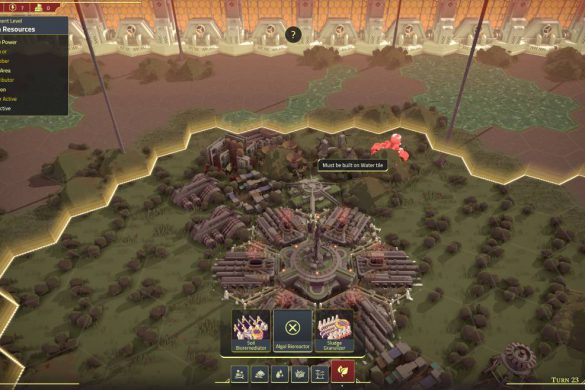 Jag har hört att i de flesta stadsbyggare ska logistik vara en rolig utmaning, här är all form av logistik ett hinder. Min byggyta är extremt begränsad. Jag behöver fylla de hexagonala rutorna med bland annat bosättningar, arbetarbostäder, vattentorn, elverk, sopstationer, etcetera… Eftersom detta även är ett turordningsbaserat spel så har jag bara ett visst antal handlingar jag kan göra per runda. Bygga ett vattentorn, avsluta min runda, bygga bosättning, avsluta runda och så vidare.