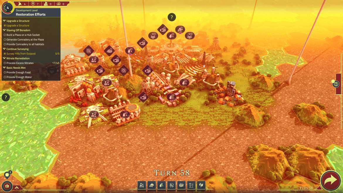 Exempelvis finns det tre ikoner i form av ringar som fylls av blixtar. En blixt är en indikation på att något är jättetokigt fel. Får jag tre blixtar så har jag fem till nio rundor på mig att åtgärda felet, annars dör vi allihopa. Åtgärdar jag felet försvinner blixten och den akuta faran är avvärjd för stunden. Men hur jag avvärjer problemet berättas inte. Ett av de mest kryptiska blixtfelen är att invånarna känner sig “isolerade”. Jag har ingen aning om hur jag ska åtgärda det och får jag tre blixtikoner med varningen “isolerade” så förlorar jag spelet och får ett meddelande att alla dött. Jag har även två liggande staplar som visar händelser. En positiv och en negativ. Men hur jag påverkar detta eller vad det ger eller ens händer vet jag inte. Spelet har inte förklarat något av denna mekanik.