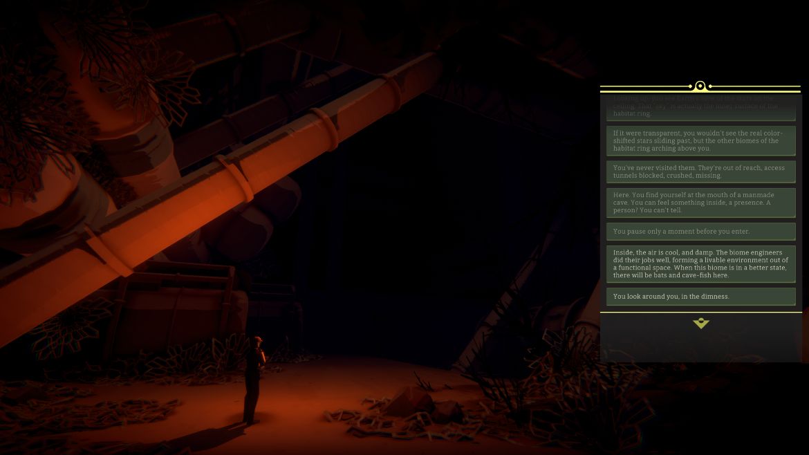 Musiken som spelas är en lugnande bakgrundsmelodi som kontrasterar mot den karga miljön. Det är också det enda ljudet i spelet så det märks att Sonderlust Studios kreativa chef Nels Anderson lagt fokus på att vi ska känna något med minimal interaktion. Nu kanske ni tänker att namnet “Nels”, känner jag ju igen. Han är en av personerna som var ansvarig för just spelet Firewatch och stämningen därifrån spiller över på detta spel.