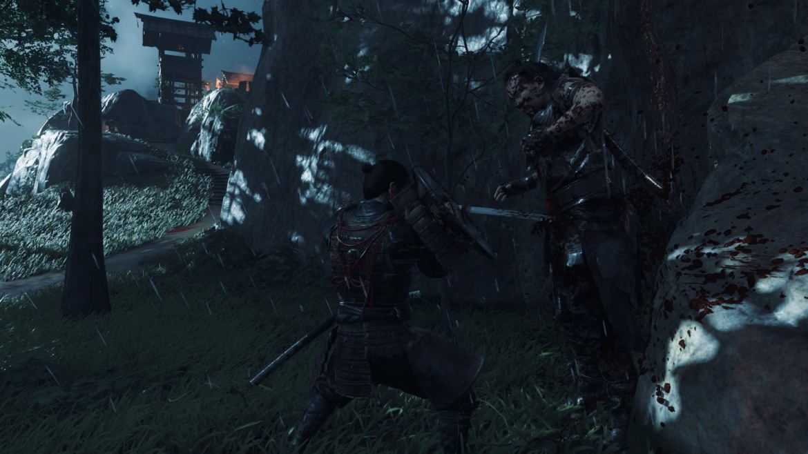 På tal om strider så kommer det ej att vara som i t.ex. Assassins Creed Odyssey där man bara kan hoppa in och svinga sitt vapen för fulla muggar och hoppas att man tar död på alla. Här så gäller det att tänka till med vilken attack du använder beroende på vilken typ av fiende du attackerar; har den exempelvis ett spjut så ska man använda vindställningen och hoppa över deras svepande attacker. När man närmar sig fiender så kan man få en prompt att locka ut dem i en lite miniduell. Här kan man sedan hålla in triangeln och inte släppa den förrän fienden attackerar dig; det här är en intressant och effektivt sätt att kunna ta ut en eller flera fiende med ett slag. Dock så kan du dö eller ta allvarlig skada om du råkar slå för tidigt. Det här är något som känns direkt plockat ur någon gammal samuraj-film; där de står stilla i sina attackställningar och bara kollar på varandra, för att sen göra ett gemensamt utfall, varpå en av dem faller död till marken.