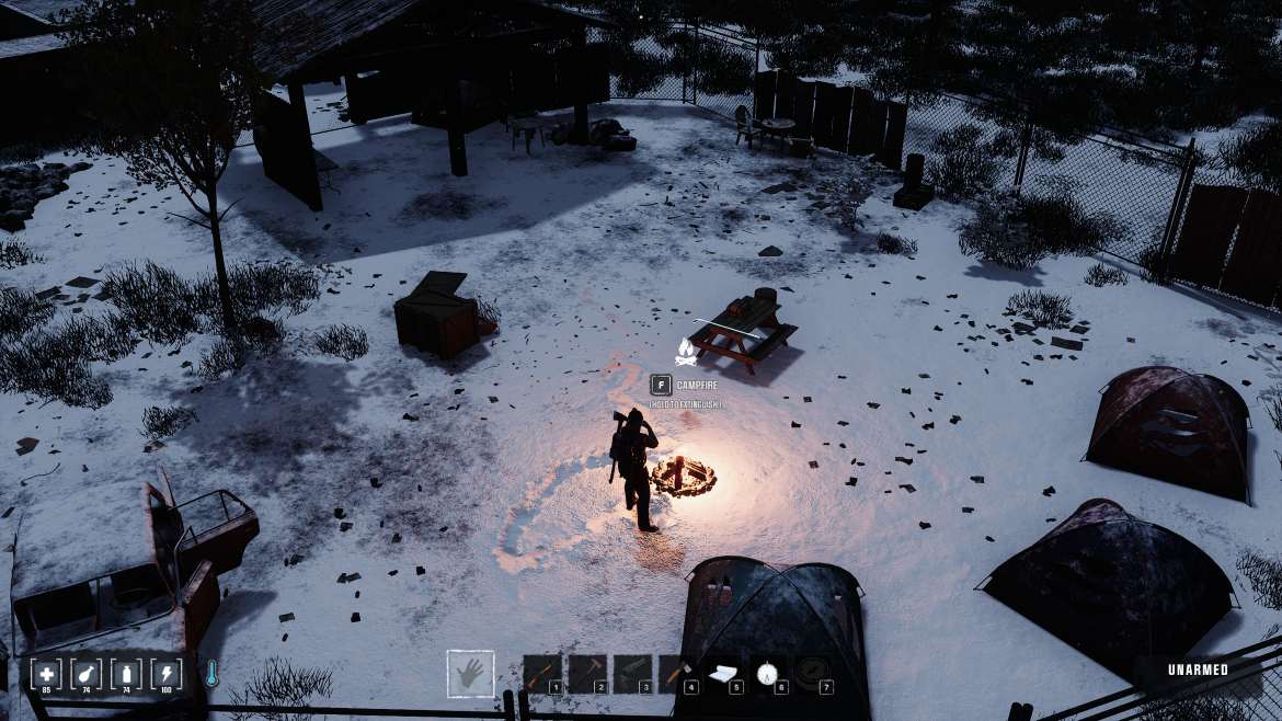Detta behåller ett mått av realism som gör att jag, som inte alls är van vid genren, enkelt kan bygga upp en bas från grunden baserat på logik. Vill jag göra det svårare för mig själv har jag även valet att strunta i befintliga byggnader och istället börja från en enkel koja gjord av pinnar jag plockat från buskar eller nedfallna träd. Oavsett start ska det så småningom utvecklas till en fullvärdig bas, det är ett av spelets långsiktiga mål.