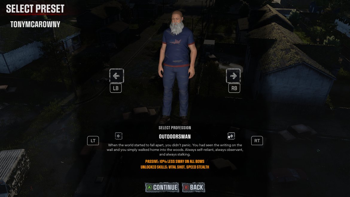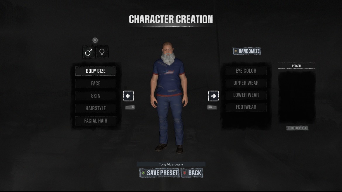 Innan jag ger mig ut i den här otroligt ogästvänliga världen behöver jag skapa en karaktär. Jag får välja utseende och vilket jobb jag hade innan världens undergång. Det finns elva olika yrken som påverkar hur min karaktär fungerar i världen.