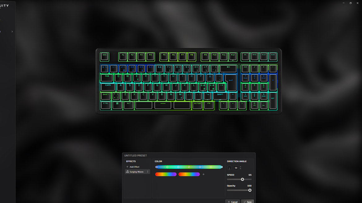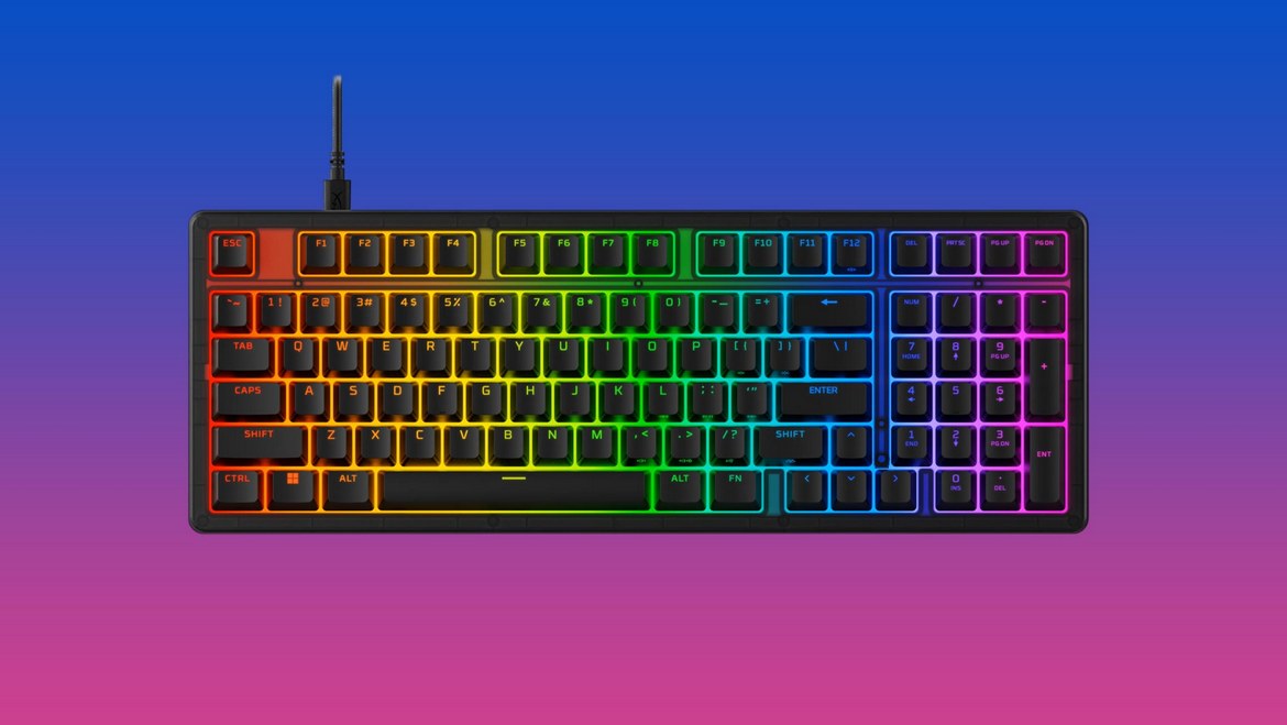 Det som däremot verkligen räddar upp skrivkänslan är att gasket-mount-prestandan är oerhört god. Ett av lagren som HyperX har klämt in är just denna monteringsmetod, vilket ger chassit en ”studsig” och flexibel känsla när du skriver. Effekten må verka subtil, men resultatet är ett tangentbord som helt enkelt känns väldigt bra att skriva på – förutsatt att du kan ignorera det skramlande ljudet från mellanslag-tangenten.