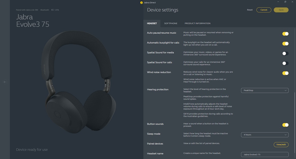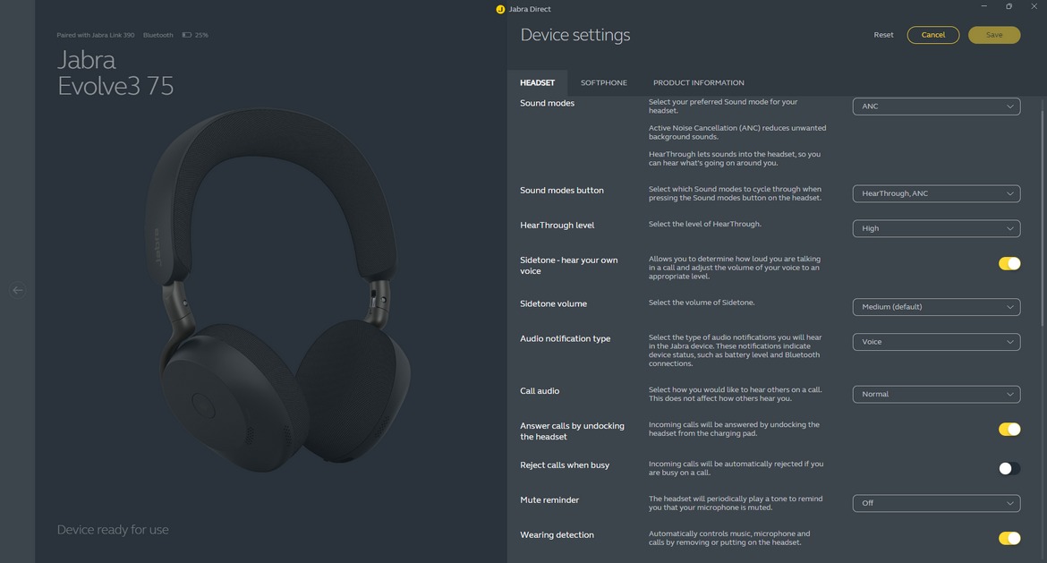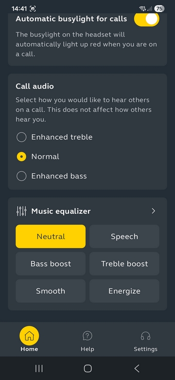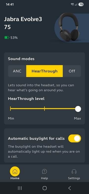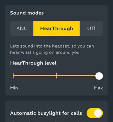 På mobilappen finner vi de vanligaste sakerna som att kunna välja mellan ANC eller HearThrough och hur mycket HearThrough ska släppa igenom. Du kan även slå igång en funktion som kallas för ”Busylight”, med andra ord är det att det slår igång LED som finns och lyser rött för att indikera till dina kollegor eller andra i din omgivning att du sitter i samtal, lite som en stoppskylt ”jag är upptagen stör ej”.