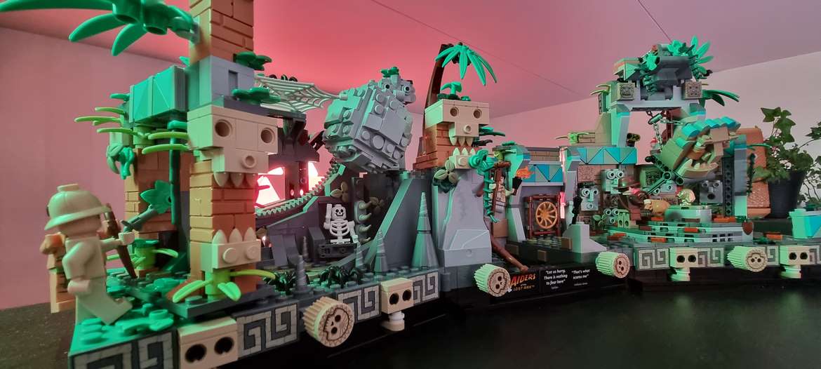 Utifrån ett lekperspektiv kan det till synes verka märkligt att det faktiskt är passande för en yngre publik, men varje del av de tre sektioner som ses här har ett anslag som lämpar sig för just det. Ingången bjuder på en funktionell stenkula som på en axel kan till synes rotera – mot utgången. Mittsektionen har en höj- och sänkbar port med en fresk på, samt ett mörkt gap, med vilket du kan placera någon av de medföljande minifigurerna över. I vårt fall blev det Satipo, som fick hänga och dingla över det avgrunden, precis som i filmen. Slutligen har vi scenen där Indiana Jones försiktigt träder fram över de fällor som gömmer sig under golvet – allt för att nå den gyllene idolen. En idol som för övrigt kan höjas och sänkas ur sin plats, och dessutom kan lysas upp. Under hela diorama-setet finns ett antal roterbara dödskallar, med vilket du påverkar scenen i fråga. Den sista scenen – med guldidolen – kan inte bara få den att höjas och sänkas, utan kan få väggen bakom att rämna. Vilket då blir startskottet från det att Indiana Jones till synes varsamt lämnat en påse fylld av sand. Något som inte riktigt gick felfritt i filmen. Men i fallet med detta LEGO-set är designen utomordentlig, och fångar verkligen andan av den fantastiska filmen. Med allt från latinamerikanska färgpaletter och lättåtkomliga mekanismer; detta är sannerligen en samlares våta dröm!