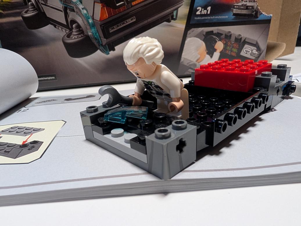 Målgruppen här är ju vi som växte upp med filmerna men Lego har skrivit på kartongen “1-2 Builders, Build together”. Lite som att de tycker att jag minsann borde få in mina avkommor till 1985 tillsammans med bilen. För att väcka känslorna har de inte snålat på detaljerna. Bilen går att bygga på två sätt. Antingen för film I eller för film II (ingen western-variant) och små saker som att det är olika nummerplåtar till de olika versionerna ger en kvalitetskänsla över bygget.